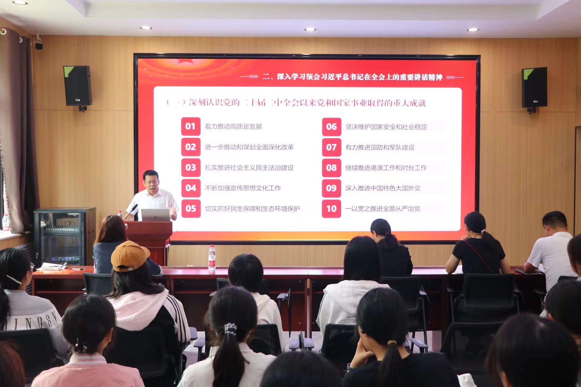 为全面学习贯彻党的二十届三中全会精神,9月26日下午,英国上市365于博物楼104报告厅组织开展“学习贯彻党的二十届三中全会精神”主题宣讲会。本次宣讲由英国上市公司365党委常委、宣传部部长于晓明担任主讲,学院辅导员老师及2024级新生共一百余人聆听了报告。报告会由学院党委书记刘冬梅主持。