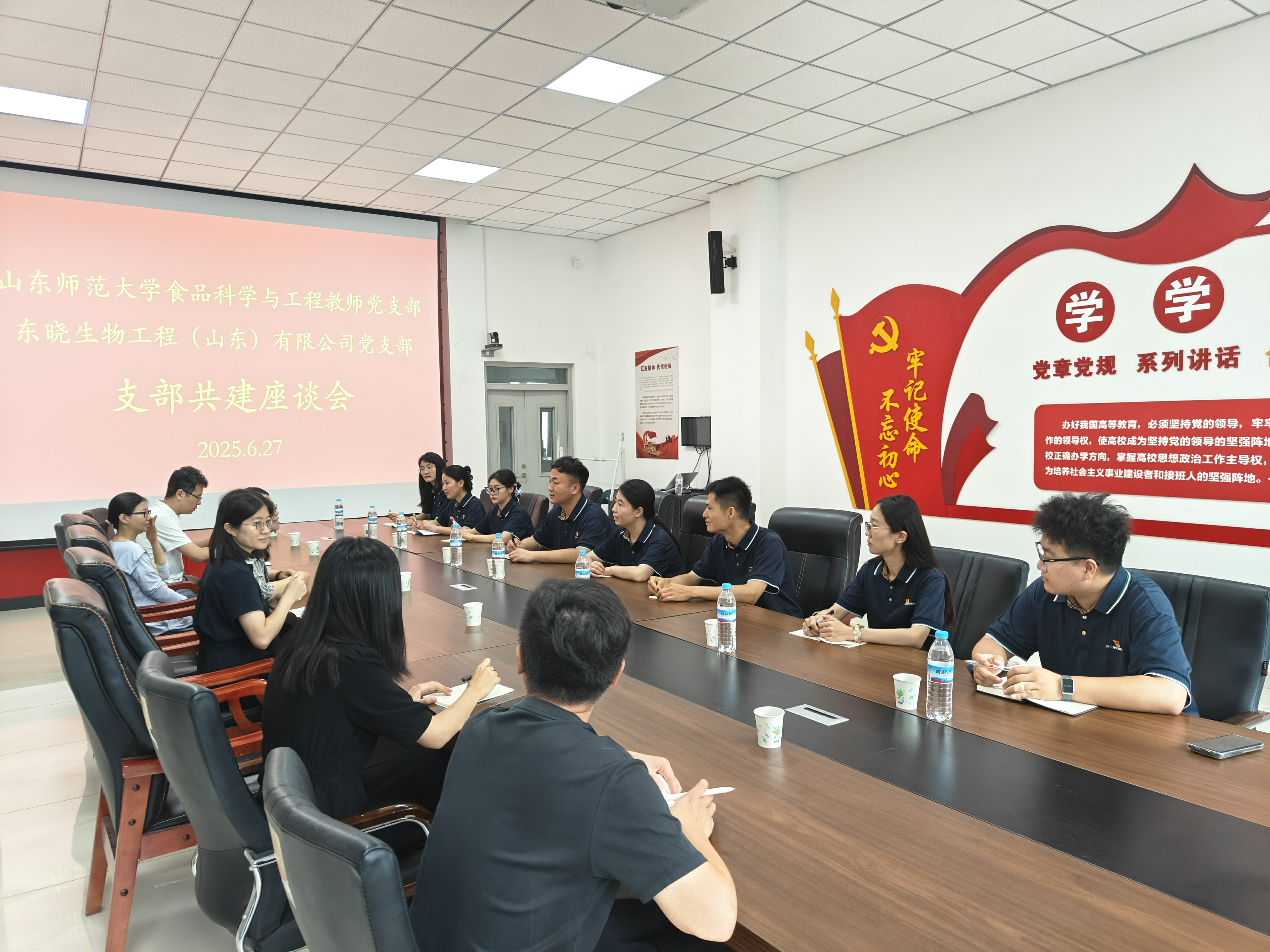 在党团活动会议室举行的座谈会上,双方围绕“党建引领业务发展”这一主题展开深入交流。食品科学与工程教师党支部书记张鸿雁介绍了学校、学院的发展历程以及学院在人才培养、科学研究等方面的特色优势;张志伟书记详细分享了东晓生物“党建+创新”的发展模式,特别提到公司与英国上市公司365的合作成果“农产品中危害物新型光热快速检测技术”荣获2024年度山东省技术发明二等奖的成功经验。