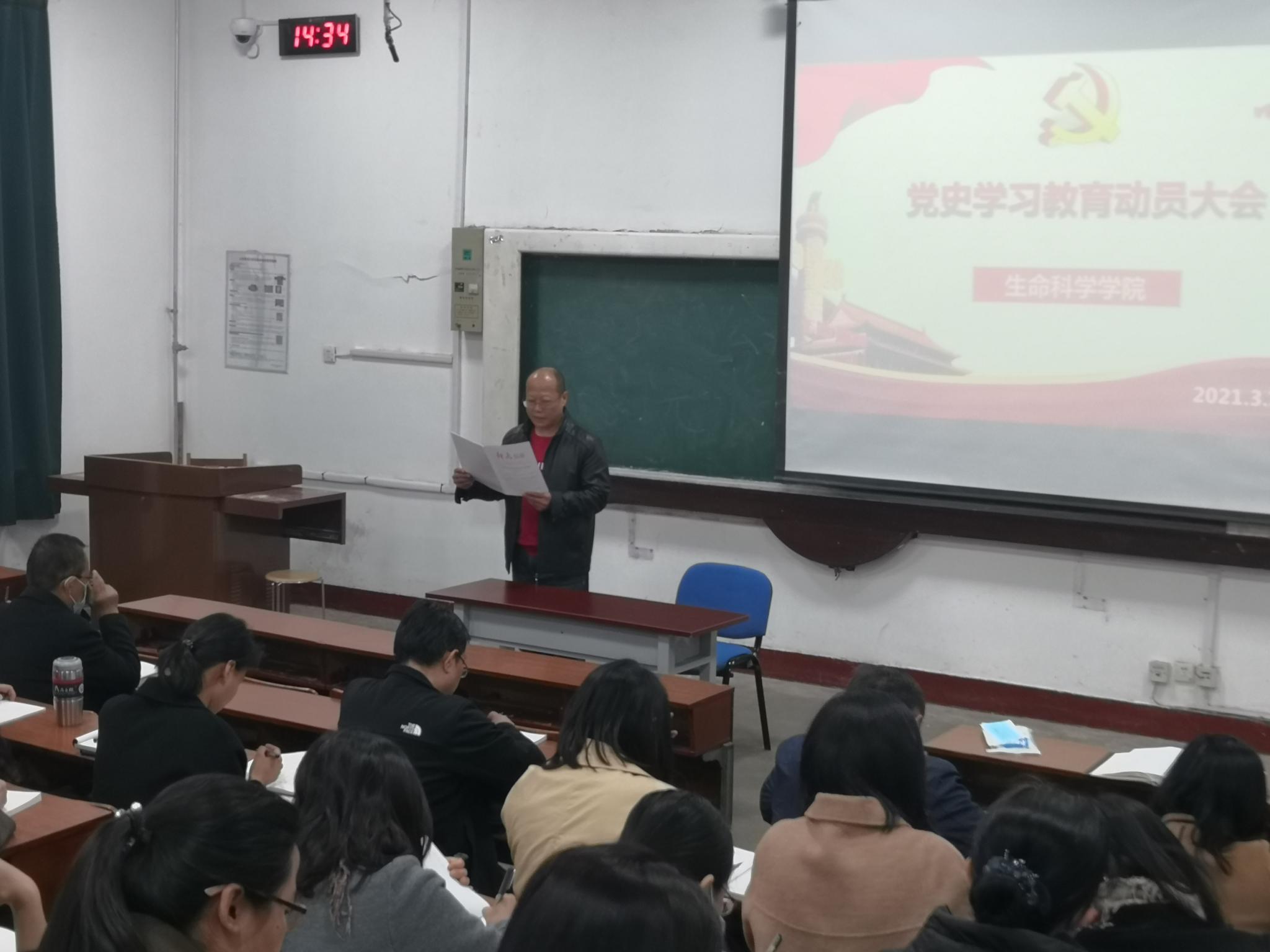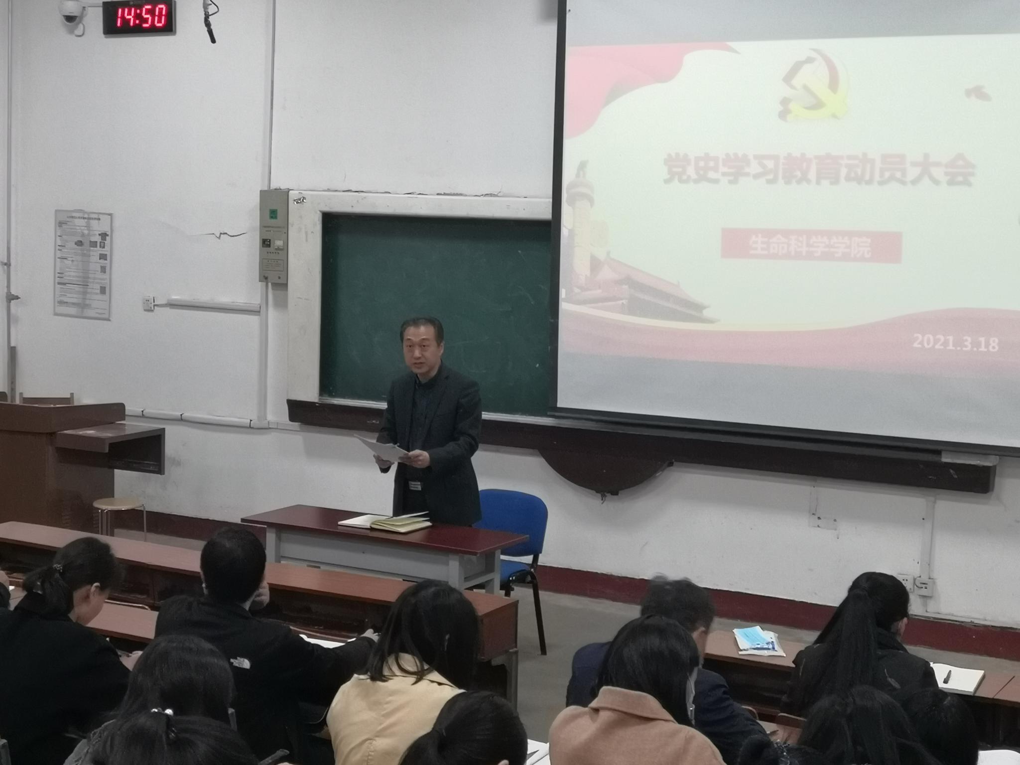 于铁强调,开展党史学习教育,是以习近平同志为核心的党中央立足党的百年历史新起点,统筹中华民族伟大复兴战略全局和世界百年未有之大变局,为动员全党全国满怀信心投身全面建设社会主义现代化国家而作出的重大决策。学院各级党组织和广大党员要充分认识开展党史学习教育的重大意义,提高思想认识和政治站位,把开展学习教育作为一项重大政治任务,结合自身实际,有针对性细化工作措施、解决实际问题,高标准高质量推进各项任务,确保学习教育取得扎实成效。他就加强党史学习教育的组织领导提出三点意见:一要落实主体责任。各党支部书记要承担起主体责任,亲自部署和参加学习教育、亲自总结和提炼学习教育成果,层层传导压力,从严从实抓好学习。二要加强宣传动员。要积极宣传上级决策部署和工作要求,让党员深刻领会开展党史学习教育的重大意义,把握主线、聚焦重点、结合工作,克服党员学习历史中可能存在的知当下而不知过往、知其表而不知其里等短板问题,高标准、高质量、高水平地参加党史学习教育,确保党史学习教育学得全面、学得深入、学得实在。三要强化统筹协调。坚持把党史学习教育与学习贯彻习近平新时代中国特色社会主义思想结合起来,与巩固主题教育成果形成长效机制结合起来,与坚定贯彻落实中央、省和学校各项决策部署结合起来,与自觉践行党的群众路线结合起来,与层层落实管党治党主体责任结合起来,与改进工作作风结合起来,强化统筹协调,不断夯实推进党史学习教育的抓手,提高学习质量。