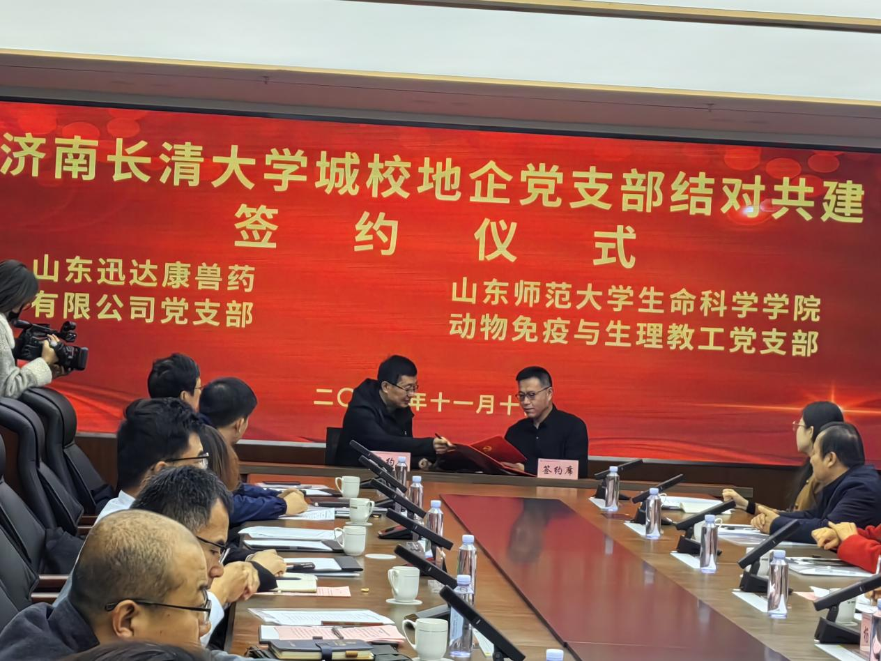 山东迅达康兽药有限公司隶属山东迅达康生物科技集团,该集团是一家定位于大健康产业,以动保产品为核心、田园综合体和品质农业为两翼,三大产业统筹发展的国家高新技术企业,先后被认定为国家高新技术企业、省级瞪羚企业、山东省“高精特新”中小企业、山东省农业产业化重点龙头企业、山东省“十强兽药生产企业”、山东省兽药行业AAA级信用等级兽药生产企业等。本次英国上市365动物免疫与生理教工党支部与山东迅达康兽药有限公司党支部的合作共建以“凝聚党员、加强组织、服务群众、促进和谐、推动工作”为目标,充分发挥双方党组织的整体合力,实现“组织共建、资源共享、事务共商、活动共办”任务要求,努力构建管理有序、服务完善、产教融合、协同育人的校企合作党建新格局。双方将共建常态化“共建工作联席会”,通过开展业务合作、参观学习、文体交流等多种方式进行更进一步的深入合作。