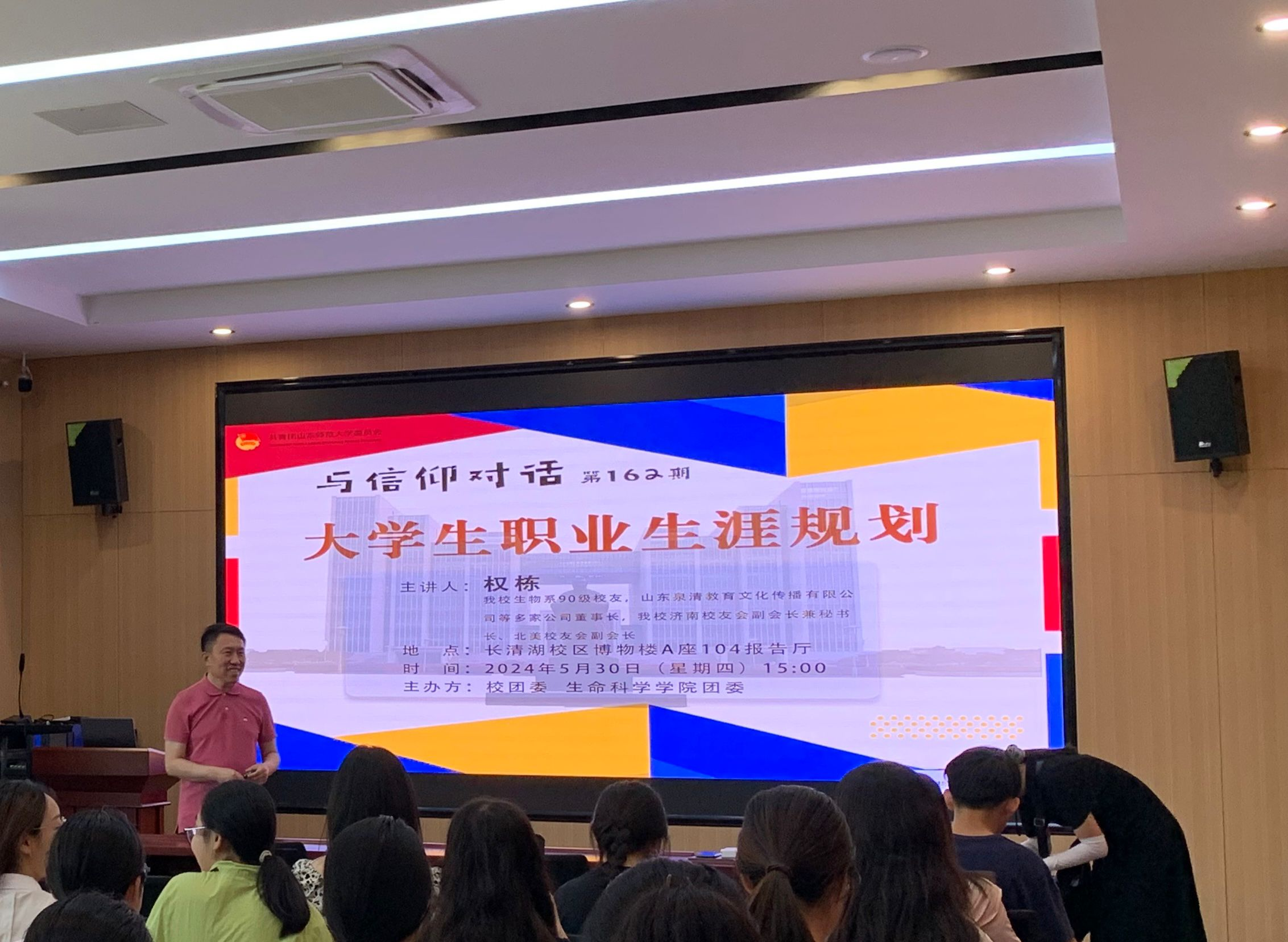 2024年5月30日,校团委与英国上市365团委在博物楼A座104联合举办第162期与信仰对话,英国上市36590级优秀校友,山东泉清教育文化传播有限公司董事长权栋应邀作“早准备,更从容”大学生职业生涯规划主题报告。学院2022级和2023级学生代表出席本次活动。