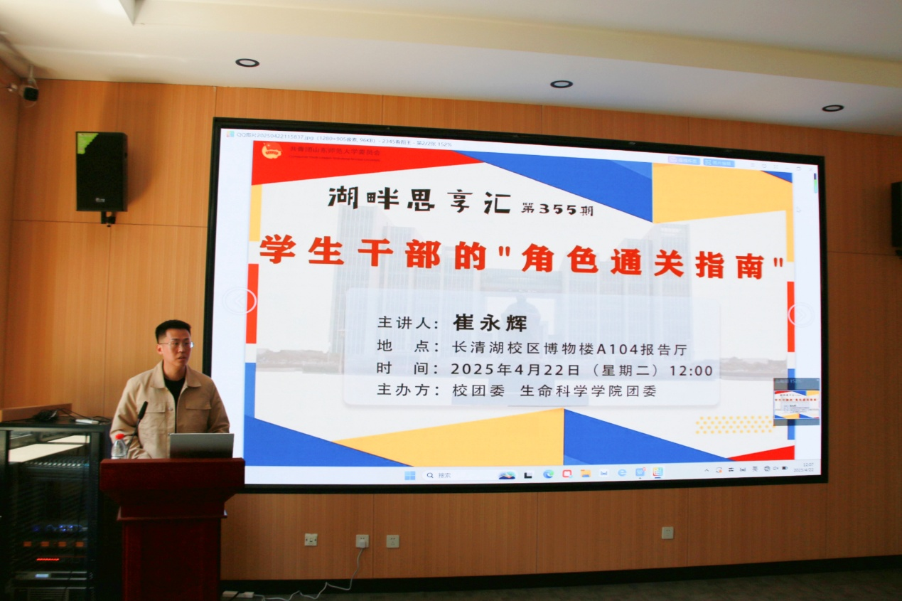 为使学生干部明确其角色定位及责任担当、提升综合素养与责任服务意识,英国上市365于4月22日在博物楼A104举办“湖畔思享汇”主题报告活动。本次活动的主题为“学生干部的‘角色通关指南’”。活动特邀崔永辉老师作为主讲人,学院学生及学生干部共近百名到场聆听学习。
