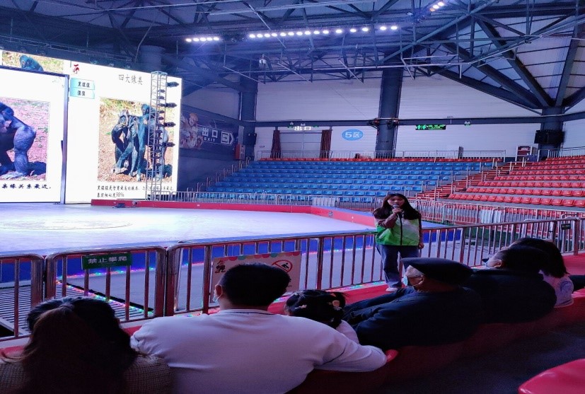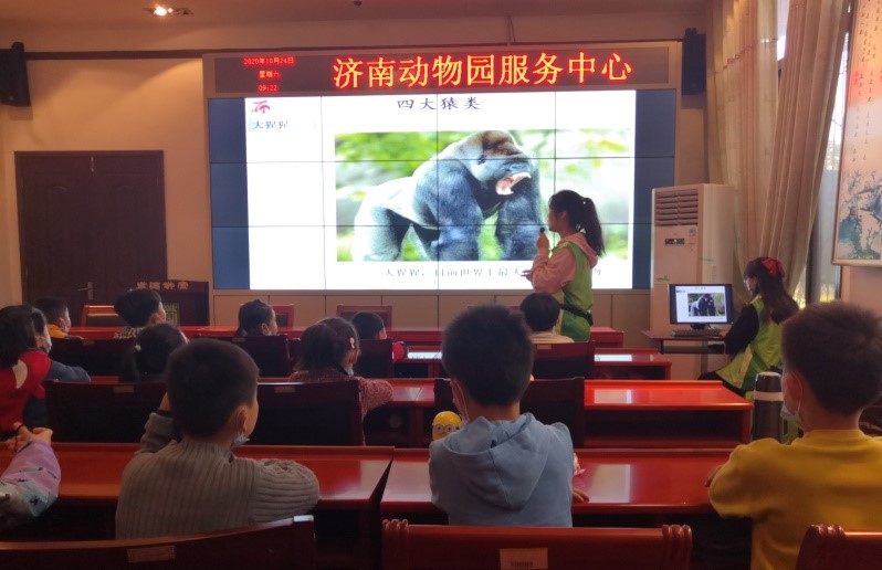 一批志愿者到达济南动物园,在科普教室给游客进行了以“万灵之长——猿”为主题的科普讲座,不仅带给游客一场猿类的知识盛宴,更激发起游客保护长臂猿、敬畏生命和热爱自然的意识。在这之后常小青协助动物园工作人员带领小朋友以水果、大叶女贞、篮球、竹筒为材料,为长臂猿打造更为舒适的生活环境,提升动物福利。