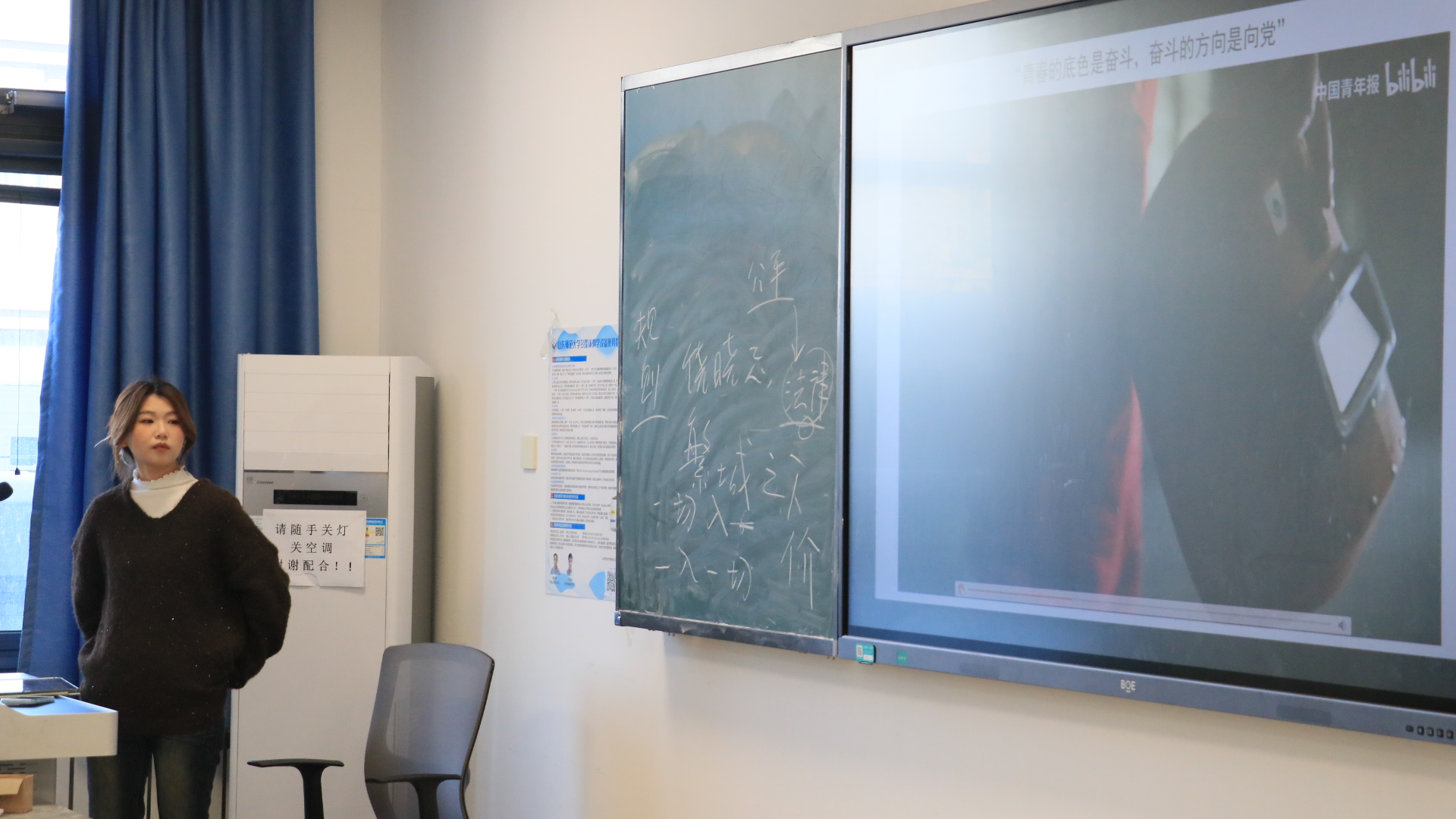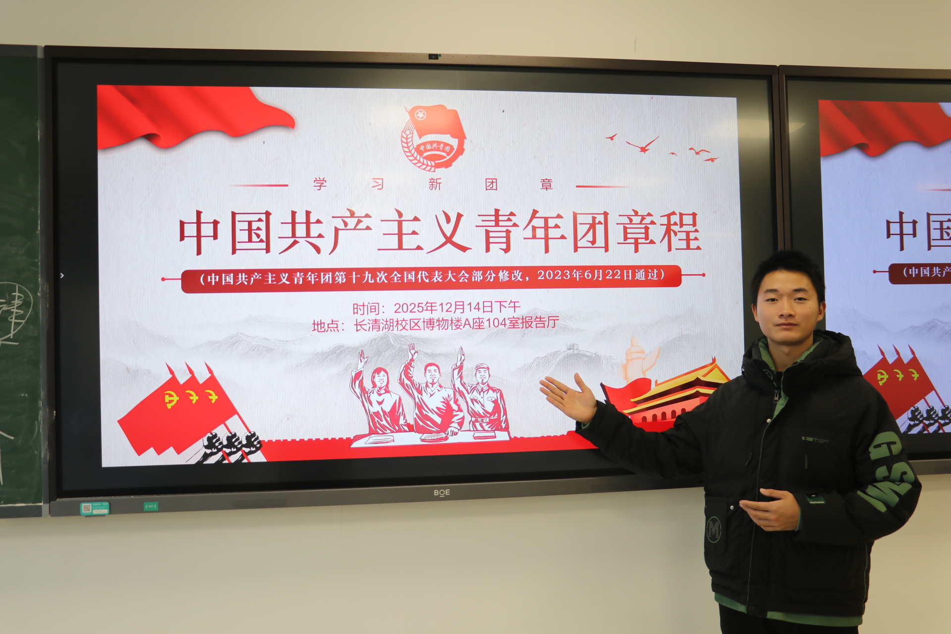 活动伊始,李梦岩以“四步走”为脉络展开分享。她谈到,走“实”学业之路,要戒骄戒躁,专注于提升专业本领,把每一个公式、每一个概念都理解透彻,这是未来一切发展的基石,没有捷径可走;谈及走“宽”科研之路,她鼓励大家要敢于尝试,在探索中培养兴趣,找寻适合自己的科研领域;在走“深”实干之路部分,她通过讲述自己作为学生干部,在组织活动中从生疏到熟练的转变,让同学们深刻领悟到“担当”不仅是荣誉,更是解决问题的能力和勇气;最后,她以自己的支教故事,生动诠释了走“远”实践征程的内涵——育人,遇自己。她的成长轨迹为在场的每一位同学提供了一个可学、可做的榜样。在分享之外,本次团课还通过视频教学,带领同学们学习了《共产党宣言》的经典篇目,解读了《中国共产主义青年团章程》,帮助大家从理论源头理解党的初心使命,明确团员的责任与义务。