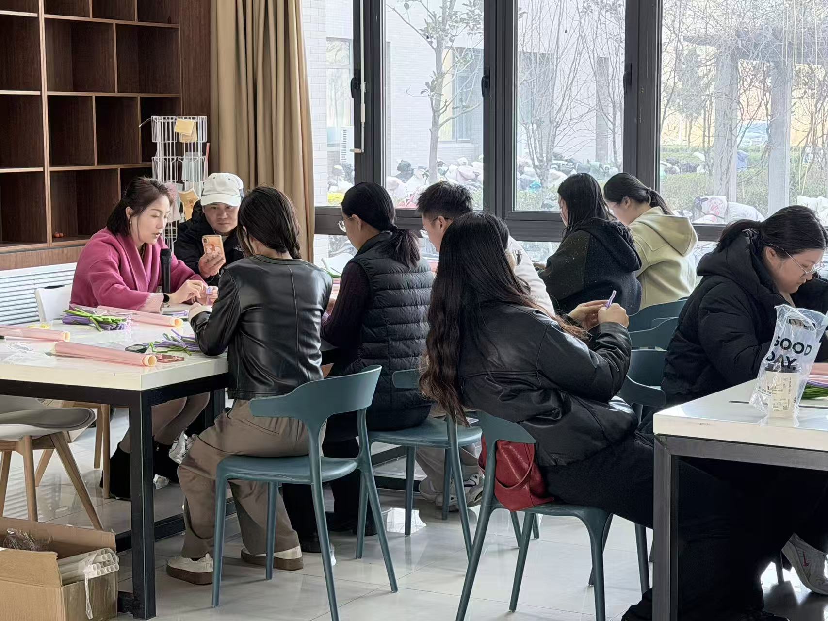 伴随轻柔的音乐,各位老师有序入场就座。活动现场暖意融融,在郭红老师的细致指导下,大家围坐在一起,以色彩丰富的扭扭棒为材料,通过弯折、缠绕、造型等手法,精心编织出一朵朵形态各异的春日花朵。老师们相互交流技巧、分享创意,指尖流转间,原本朴素的扭扭棒被赋予鲜活生机。现场洋溢着欢声笑语,大家在轻松的交流中感受春日生机,在精致的场景布置中品味生活之美,处处洋溢着青春活力与温暖气息,让每一位参与者都沉浸在向美而行的愉悦氛围里。