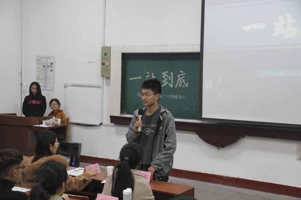 赛前,伴随着歌曲《Beautiful World》,一幅幅生物界的奇趣画卷眼前铺展,点燃现场气氛。主持人吴雪首先对大家的到来表示欢迎并介绍比赛规则,随后紧张激烈的比赛正式开始。第一轮比赛为判断题,在规定的的一分钟内看屏幕答题。队伍们或分工明确,或团结一致。即使有不少知识盲区致使失分,也恰如一次自我检测来成就更好的自己。首轮答题完毕后60进30,筛选成功者进入下一轮。几分钟过后,激动人心的时刻到来,主持人宣布晋级队伍名单,比赛来到更加精彩的填空环节。难度升级,上场气氛微微变化,选手们紧张却不改信心和热情。其中,利刃小海微队凭其扎实的生物学专业知识和丰富的积累再次赢得掌声阵阵;夕阳红队也展现了强劲的功底。第二轮筛选过后,每场五支队伍进入终极角逐。论述题目密切结合院刊《生物通讯》文章内容,各晋级队伍分别阐述了对一角鲸、四膜虫、虞美人与罂粟花等相关问题的认识,答案异彩纷呈。两轮比赛中间,王裔君老师充分肯定了此次活动的意义,并鼓励同学们努力学习专业知识;大三学长向同学们提出不懈探索、实事求是等建议,言语恳切,意味深长。三轮比试结束,“一站到底”知识竞赛圆满落幕。