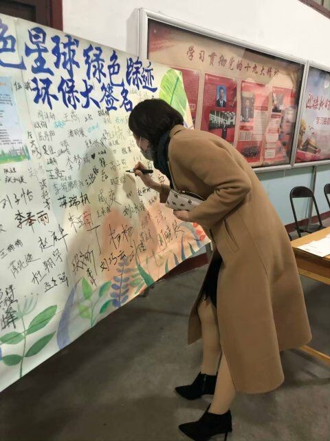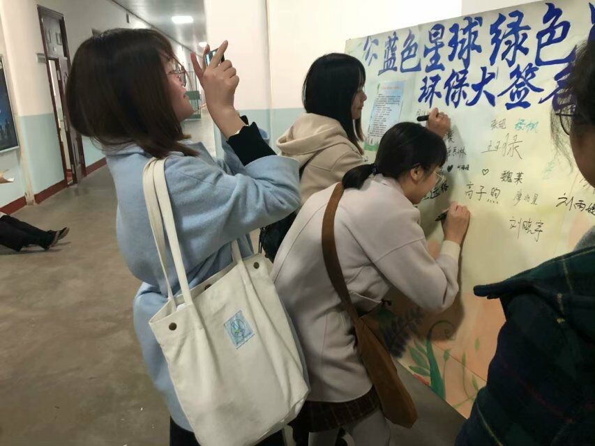 此次活动分为两部分,卫生部成员向前来参观的同学们讲解废物利用大赛优秀作品制作过程,同学们阅读环保倡议书后在签名板上签字、在明信片上写自己的环保宣言。清晨,卫生部成员将签字板及优秀作品展出,此次活动由此拉开了序幕。李娜及王裔君在签字板上签名,并表达了她们的一些见解,分享了自己的经验。许多17、18级学生来到展览现场,聆听讲解员讲解作品制作过程。听罢,大家走到展板前,看着环保倡议书,拿起马克笔,庄严地签上了自己的名字。一些同学还有感而发,在明信片上写下了自己的环保宣言。“环保需要每个人的努力,不能将自己置身事外”一张明信片上写着这样的话。这一张张满载承诺的明信片,彰显了山师人的良好品质。寥寥几笔,就足以传达出大家对保护环境的热忱。活动从早上八点开始,下午六点结束。虽然只有短暂的一天,但同学们都积极地参与进来,为保护环境尽了自己的一份力量。一整天的雾霾也没有阻挡住同学们前来参加活动的热情,反而更加坚定了同学们加入环保行动的决心。最后,卫生部成员整理签字板,保存明信片,至此,此次活动圆满结束。