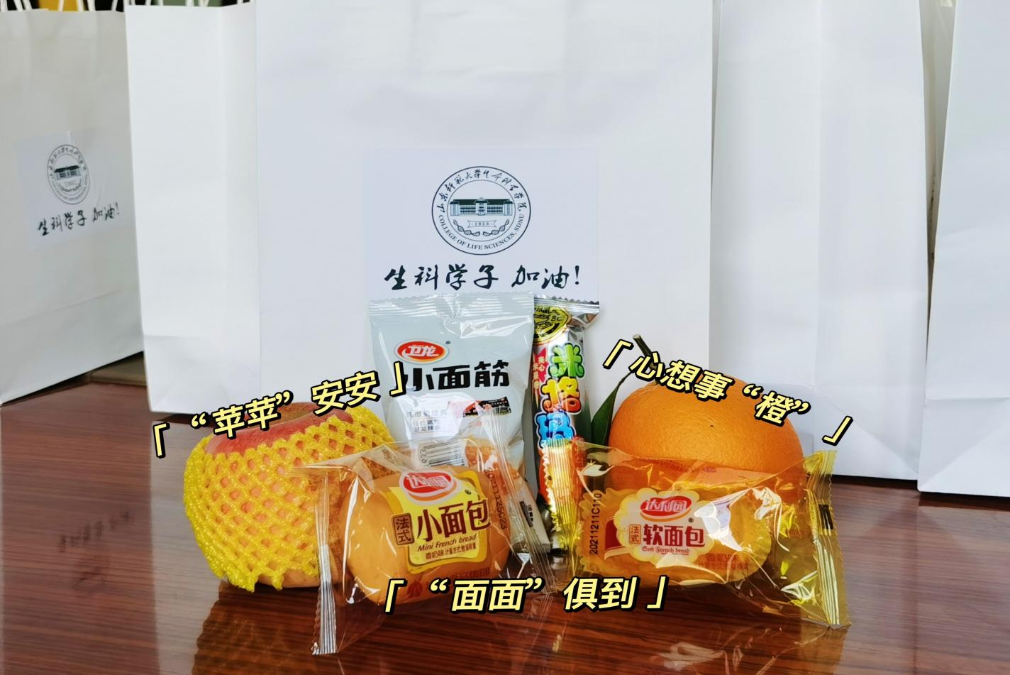 本周末,学院将有近400名学子走进考场参加研究生入学考试,我院提前筹备,真心实意为考生着想,为考研学生提供温暖与便利。学院学工办主任、团委书记、生物技术辅导员师静,2018级辅导员王裔君将加油助力包亲手送到每一位学子手中,并向他们送上学院诚挚祝福。加油助力包中包括苹果、橙子、零食等,寓意“平平安安、心想事成、考试答题面面俱到”。