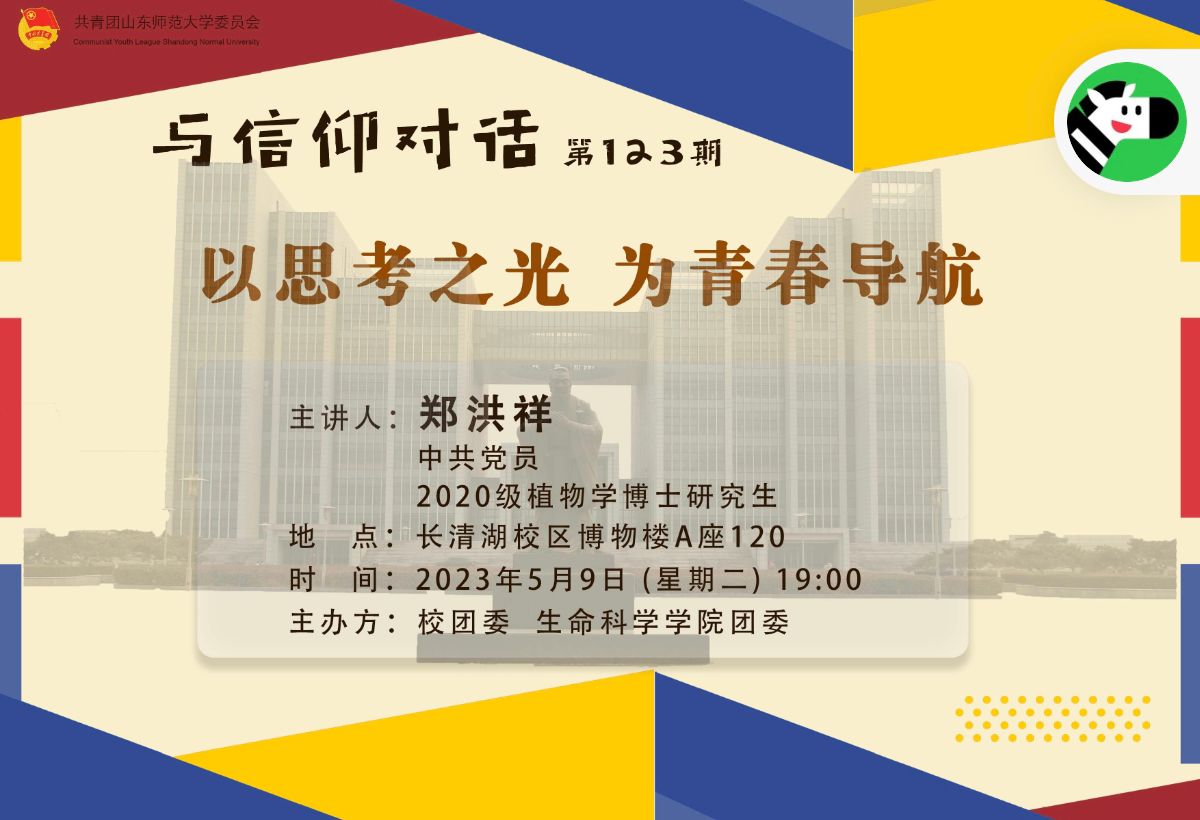 2023年5月9日晚上,在英国上市公司365长清湖校区博物楼A座120会议室,校团委与英国上市365团委共同举办的主题为“以思考之光 为青春导航”的“与信仰对话”讲座顺利举办。本次活动由中共党员、2020级植物学博士研究生郑洪祥担任主讲人。