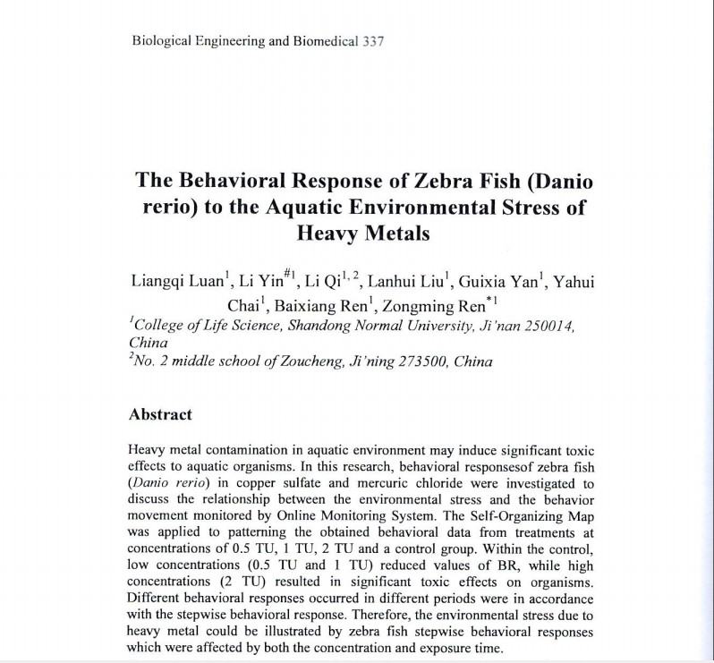 生态学自1866年被德国动物学家海克尔(Ernst Heinrich Haeckel)首次提出,目前已经发展为”研究生物与其环境之间的相互关系的科学”。由于与人类生存与发展的紧密相关而产生了多个生态学的研究热点,如生物多样性的研究、全球气候变化的研究、受损生态系统的恢复与重建研究、可持续发展研究等。本实验采用四极阻抗技术分别捕获斑马鱼在不同浓度的硫酸铜和氯化汞中的行为信息,利用A/D转换系统将其转换为数字信号,用设备自带的软件进行自动分析,转化为折线图和SOM图观察数据变化,根据构建的stepwise behavioral response model (SBRM) 分析鱼类行为,以达到检测水质的目的。创新了原始化学检测的方法。本次实验数据用于构建该监测系统数据库,为检测环境水质提供对比数据。