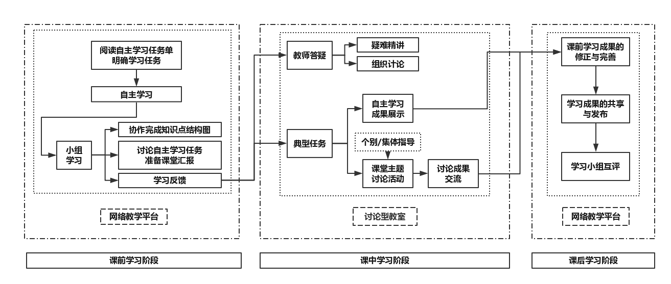 本课程借鉴翻转课堂教学模式的一般流程, 结合中学生物学课程论的课程特点与学生学情, 提出了线上线下融合的混合式教学实施三阶段教学新流程。并以促进学生理论知识与素养发展为目标指向,设计组织了课前自主研讨、课堂疑难突破、成果展示、总结归纳、课后融会贯通的多样化学习活动,以促进学生在活动过程中提升素养、发展能力、掌握知识。