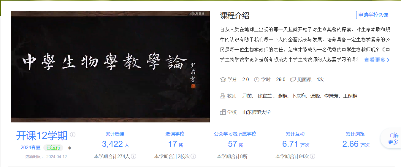 图1《中学生物学教学论》智慧树在线平台的课程页面