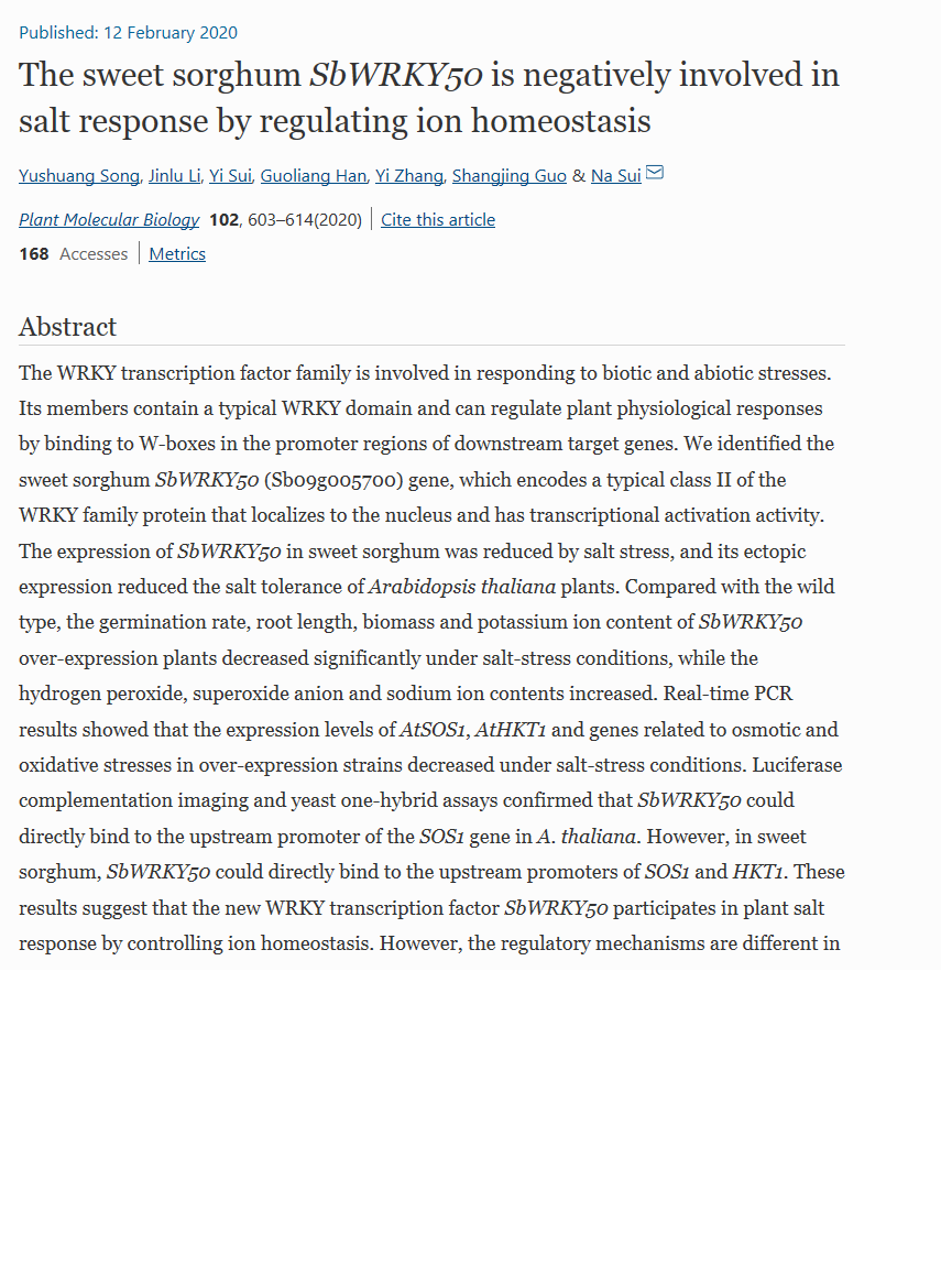 隋娜 The sweet sorghum SbWRKY50 is negatively involved in salt response by regulating ion homeostasis.pdf