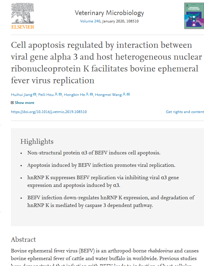 王洪梅 Cell apoptosis regulated by interaction between viral gene alpha 3 and host heterogeneous nuclear ribonucleoprotein K facilitates bovine ephemeral fever virus replication.pdf