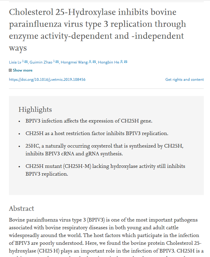 何洪彬 Cholesterol 25-Hydroxylase inhibits bovine parainfluenza virus type 3 replication through enzyme activity-dependent and -independent ways.pdf