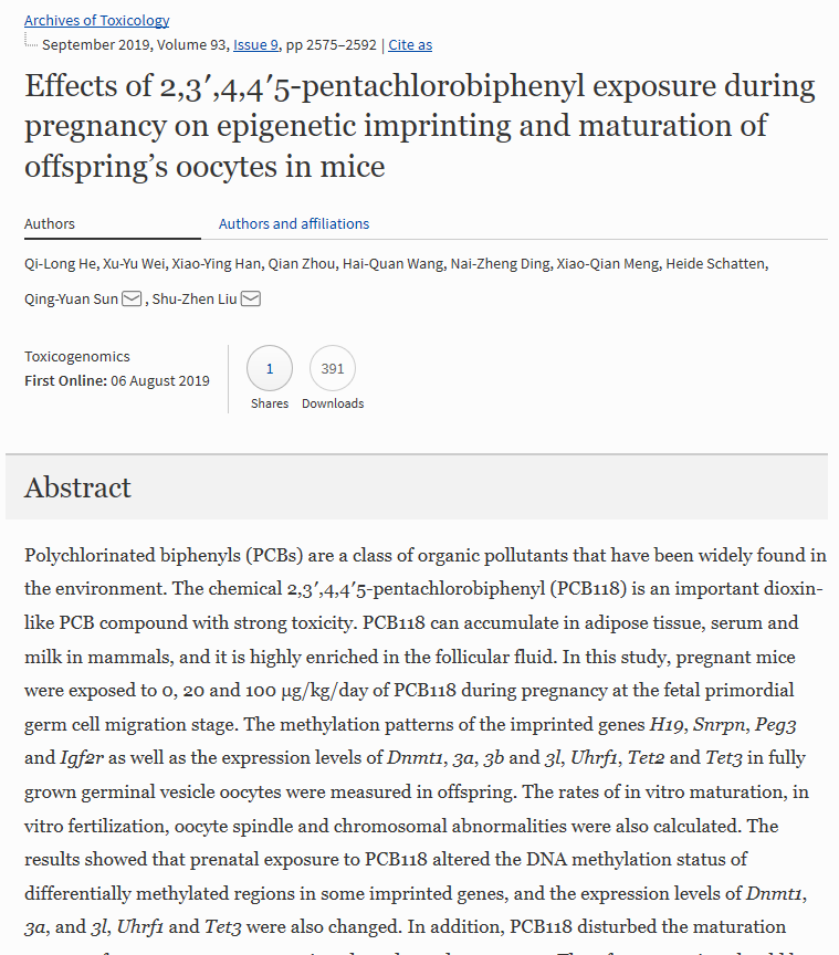 刘树真 Effects of 2,3′,4,4′5‑pentachlorobiphenyl exposure during pregnancy on epigenetic imprinting and maturation of offspring’s oocytes in mice.pdf