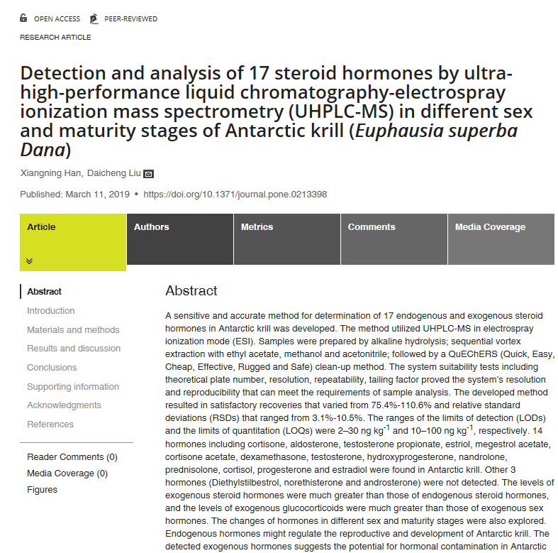 刘代成 Detection and analysis of 17 steroid hormones by ultra-high-performance liquid chromatography-electrospray ionization mass spectrometry (UHPLC-MS) in different sex and maturity stages of Antarctic krill (Euphausia superba Dana).pdf