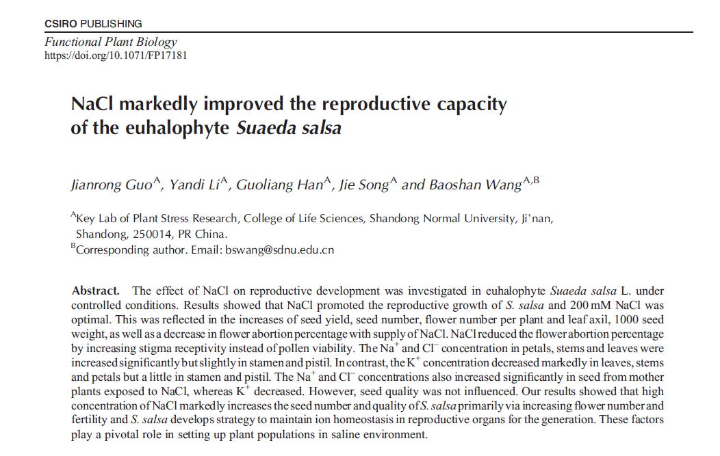 我院王宝山教授在Functional Plant Biology期刊发表学术论文