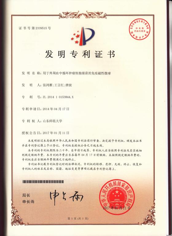 我院张鸿雁副教授获得授权专利:用于外周血中循环肿瘤细胞捕获的免疫磁性微球