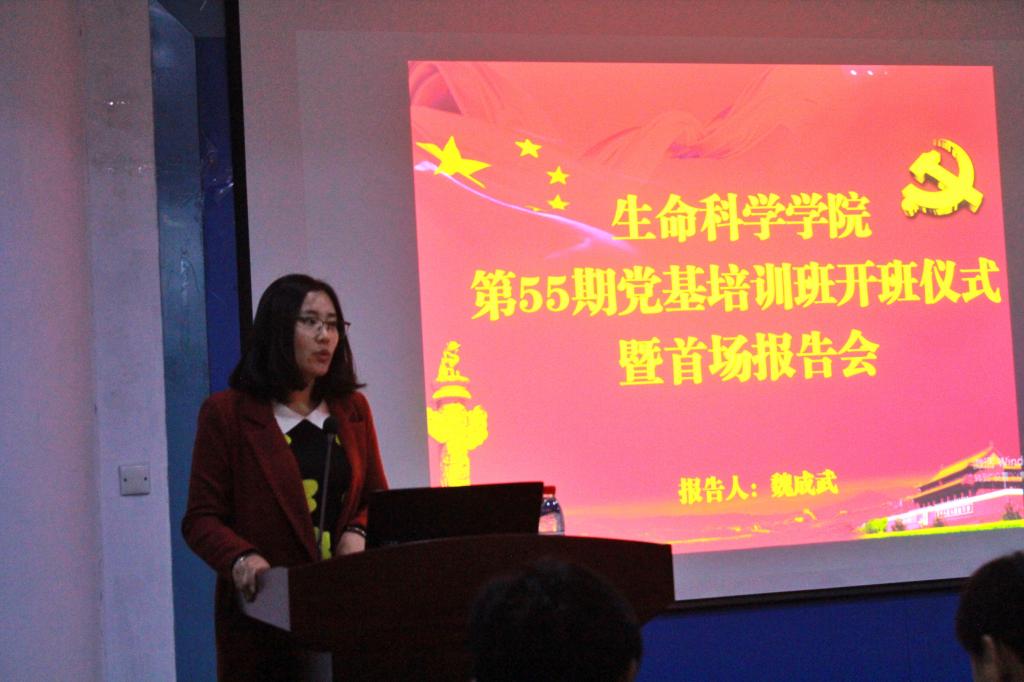会上,魏成武为培训班学员做了题为《坚定理想信念,争做时代先锋——与大学生共话入党动机》的辅导报告。报告从“世界再次把目光聚焦中国”“中国共产党是民族复兴的中流砥柱”“加入中国共产党是当代大学生的正确选择”三个方面展开,紧密结合新时期党建工作新要求和大学生思想实际,全面解读了党的十九大召开的时代背景、主要任务、代表构成和重大意义;总结回顾了我们党96周年光辉历程,强调指出中国共产党的领导地位是历史和人民的必然选择,深刻阐述了中国共产党在实现中华民族伟大复兴中国梦的进程中所担负的光荣使命;指出加入中国共产党是中国有志青年的一贯追求,勉励入党积极分子不断加强学习,加强党性锻炼,提高政治觉悟,坚定马克思主义信仰和共产主义信念,树立全心全意为人民服务的宗旨观念,自觉接受党组织的教育、培养和考察,争取早日入党。会末,史家静对参加此次党基培训班的同学们提出了期望和要求。她鼓励同学们课上认真听讲、勤于反思,课下积极学习党章党规和相关内容。