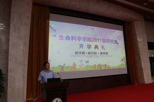 首先,王宝山教授代表全体师生员工对现场嘉宾表示诚挚的问候,对研究生新同学的到来表示热烈的欢迎。他向新同学介绍了学院的办学历程和近年取得的可喜成绩,指出建设生物学一流学科是学院乃至学校高等教育发展的重要时刻,在座的研究生将迎来前所未有的机遇和挑战,希望同学们把握机会,迎接挑战,实现人生更大的价值和意义。他指出,与山东省农科院的战略合作掀开了生科院发展的新篇章,双方合力,研究生培养的质量和层次必将上升一个大的台阶。