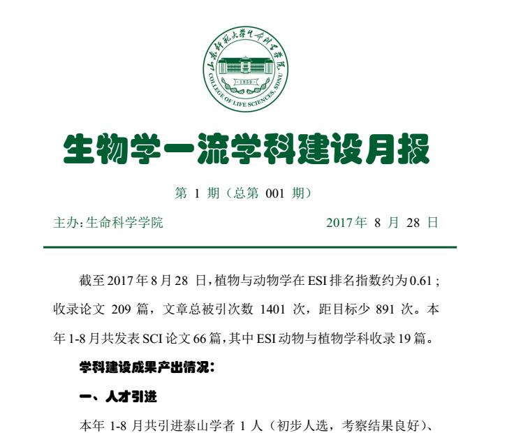 《月报》分纸质版和电子版两种形式,今后每月底结集印发一期,跟进报道生物学一流学科建设进展,客观反映学科竞争力与成果产出情况,主要包括ESI排名、人才引进、发表论文、科研项目、获奖情况等内容。首期《月报》汇集整理了2017年1-8月的数据,数据翔实、简明扼要、版面整洁,学科建设情况和师生科研产出与贡献情况一目了然,受到师生普遍好评。