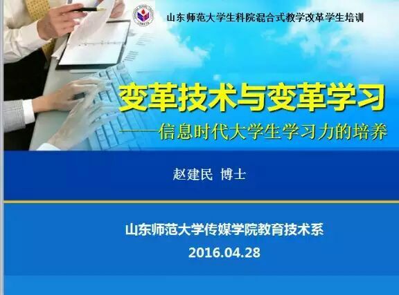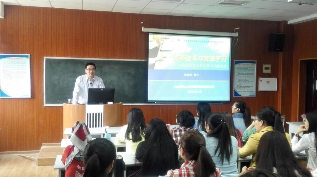 4月28日下午,我校传媒学院赵建民博士在千佛山校区3607教室为我院参与混合式教学的同学们做了题为变革技术与变革学习的专题报告,全面向同学们介绍了身处信息化时代的大学生如何有效提高学习力,应对新的时代挑战。