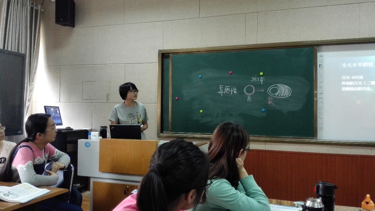 在观摩课前,尹苗老师首先就如何开展理工科基础理论课的混合式教学设计与组织进行了说明,就理工科基础理论课的特点、混合式教学中教学目标的实现途径、自主学习任务单的作用等方面与参加本次观摩课的老师们进行了交流。本次观摩课的课堂展示部分围绕细胞内膜系与蛋白质分选展开,通过混合式教学的形式完成对知识内容的传授。课前学生以小组学习的形式通过我校教学平台完成自主学习,再通过课堂教学环节完成学习成果展示、教师答疑及课堂主题讨论。在课堂授课环节,同学们以小组的形式展示了课前自主学习成果,再由老师对同学们的讲解进行点评及精讲。混合式教学模式的应用突出了学生在学生学习过程中的主体地位,真正体现了学生学习的自主性,同时也极大程度上促进了学生的综合学习能力和创新能力的提高。