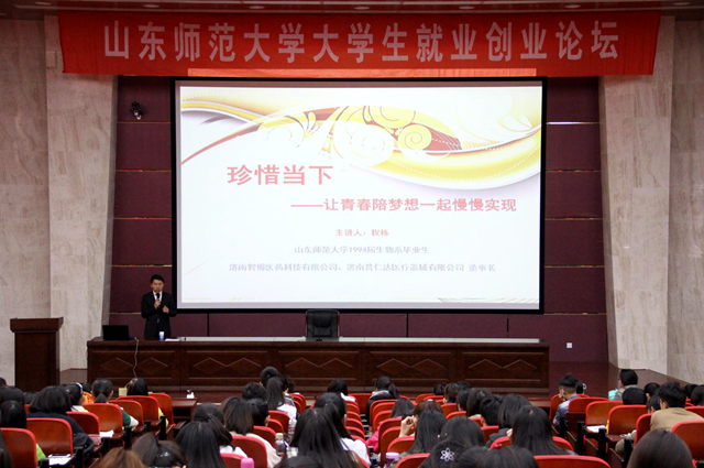 3月23日下午,大学生就业创业论坛在千佛山校区教学三楼报告厅举行,我院94届生物系毕业生权栋应邀为同学们做了题为 “珍惜当下――让青春与梦想一起慢慢实现”的报告。 来自各学院的近三百名同学参加了报告会。