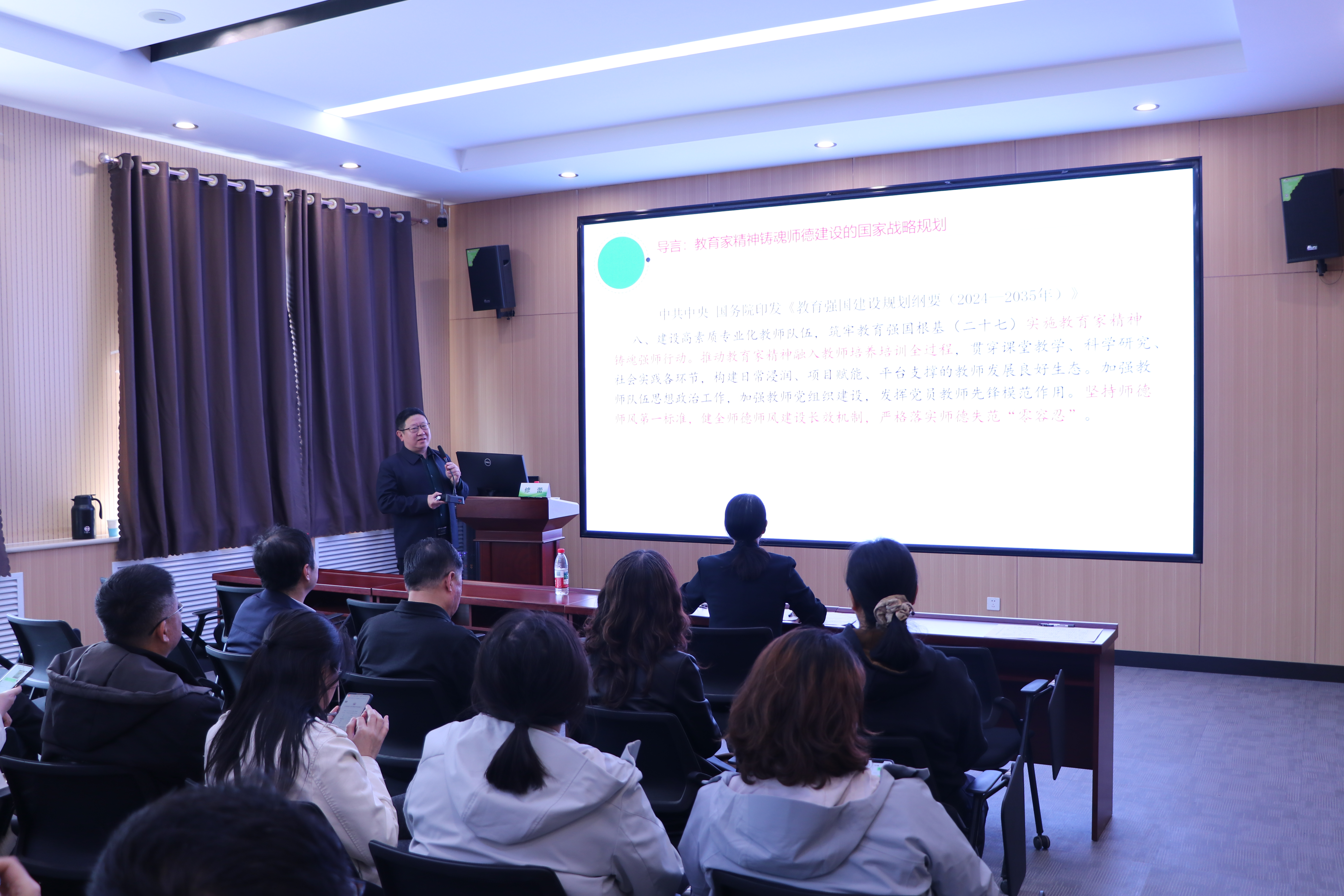 修蕾研究员以深厚的理论功底,围绕“教育家精神的时代内涵”“新时代师德教育的核心要义”以及“以精神铸魂引领师德实践”三个方面展开系统阐述,深入浅出地剖析了师德师风在教育教学中的核心地位,指出教育家精神是新时代师德建设的灵魂指引,是教师立身从教、育人成才的精神支柱。同时,结合自身丰富的实践经验,针对当前师德教育工作的重点与难点,提出了具体可行的实践建议,强调广大教师要以教育家为榜样,把教育家精神融入日常教学、师德修养与育人全过程,坚守教育初心、恪守师德底线,以高尚的道德情操、深厚的学识素养关爱学生、引领学生成长。