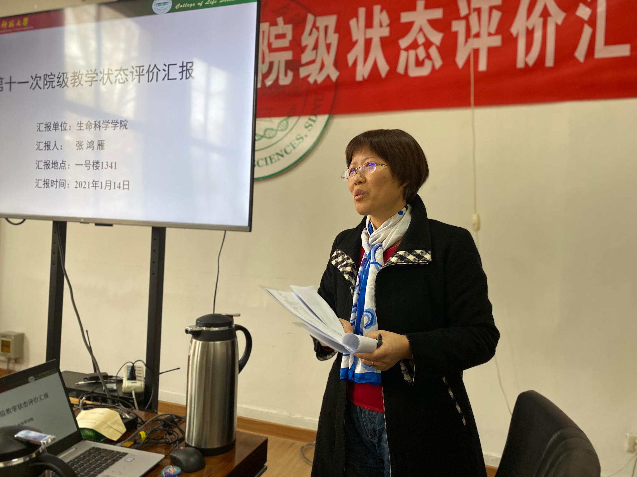接下来,学院教学副院长张鸿雁代表生科院做汇报工作。她从师资队伍、教学建设、教学改革与教学成果、教学运行、质量监控、人才培养质量、学院特色七个方面进行了自评和介绍。学院生物科学专业获批国家级一流专业、顺利通过生物科学专业二级师范认证、三门本科课程入选首批国家级一流课程等方面的好做法给大家留下了深刻印象,专家们纷纷点赞。同时,评估专家组对学院的各项教学评估材料进行了现场查阅,抽检了教学档案、试卷、毕业论文、实习等材料,并就学院教学工作提出了富有建设性的意见,气氛交流热烈。