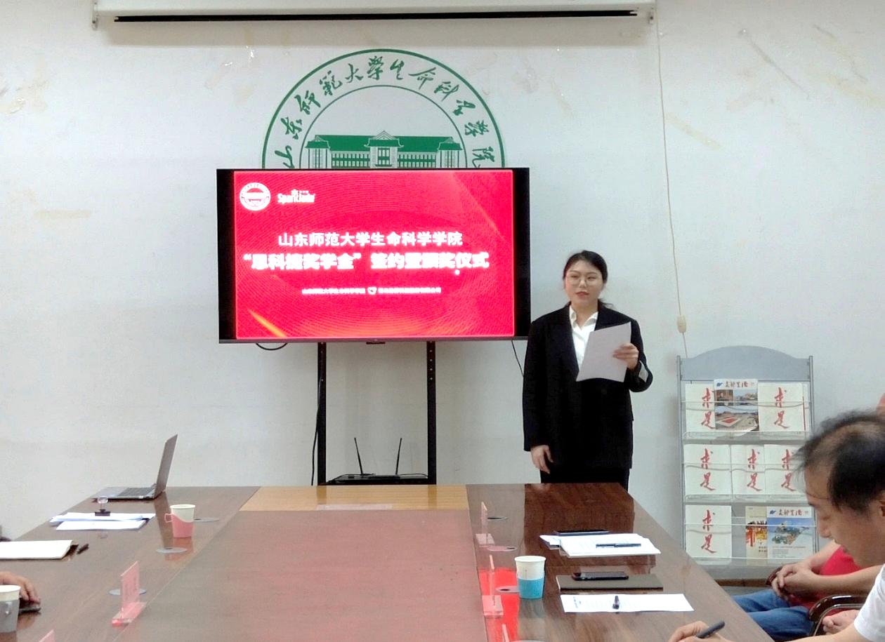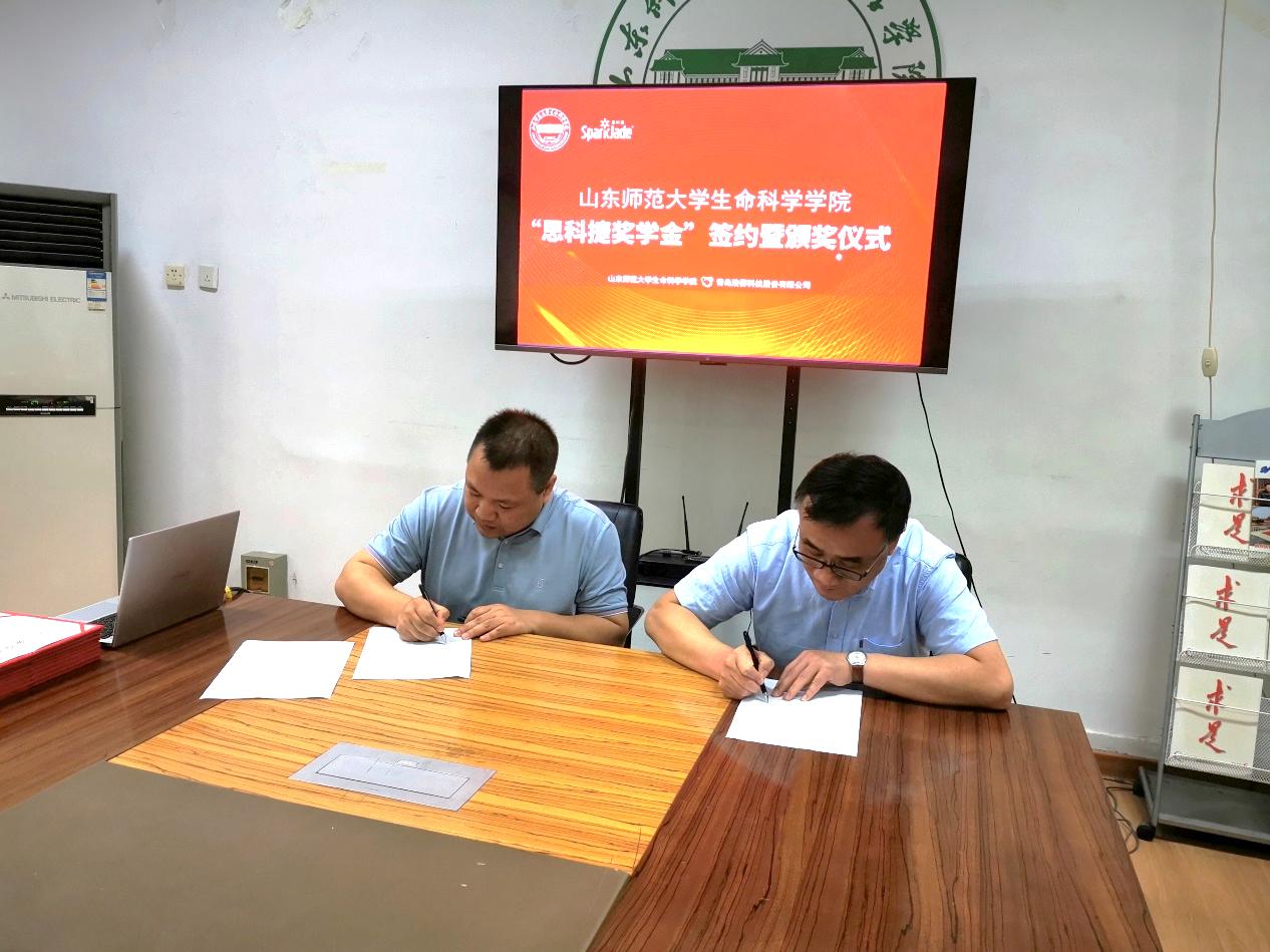 仪式开始,张小波董事长和杨桂文院长分别介绍了青岛浩赛科技有限公司和英国上市365的基本概况,并代表两方单位执笔签约、握手合影。杨小波董事长表示,非常荣幸与英国上市365合作,欢迎更多优秀人才、有志之士加入浩赛科技共同发展。杨桂文院长希望“思科捷奖学金”的设立能促进人才培养的同时,更能促进生物技术产业的发展,实现双赢。随后,企业领导为9位获奖同学颁发荣誉证书。2018级动物学专业蔡彤作为获奖学生代表发言,她首先向学院和企业致以最真诚的感谢,感谢青岛浩赛科技股份有限公司的鼓励和支持,感谢母校多年的培养与教育,表示未来获奖学生们将以更优异的成绩回馈社会,做对社会发展有贡献的人。颁奖仪式结束后,全体同学和各位领导在文化楼前合影留念。