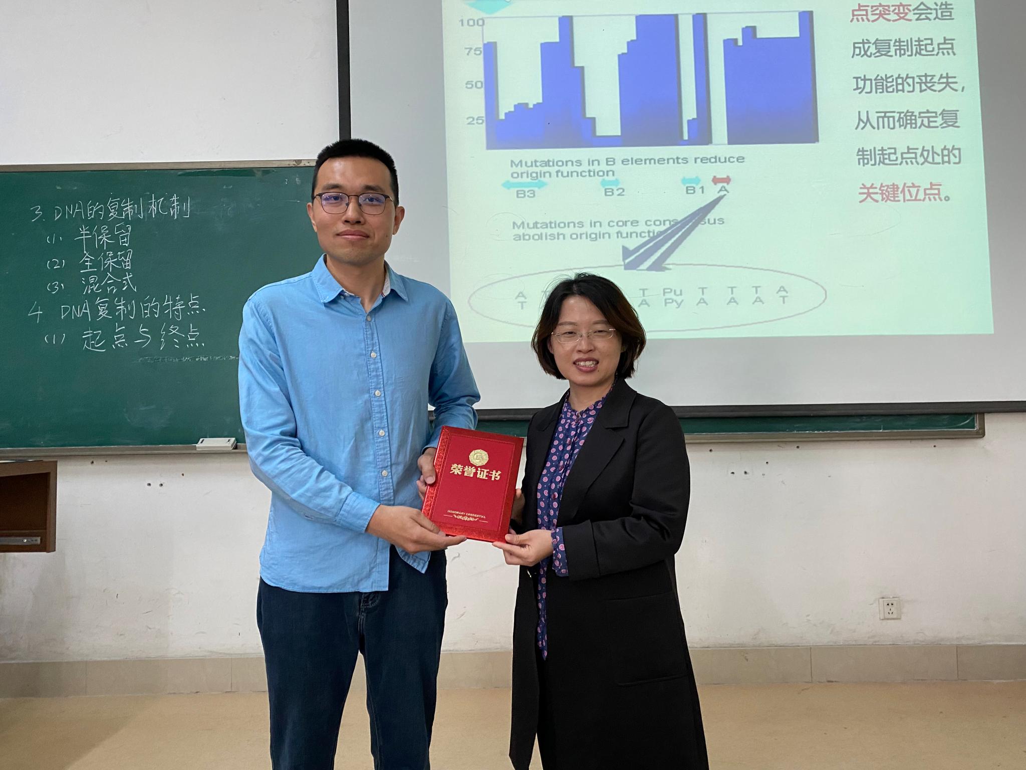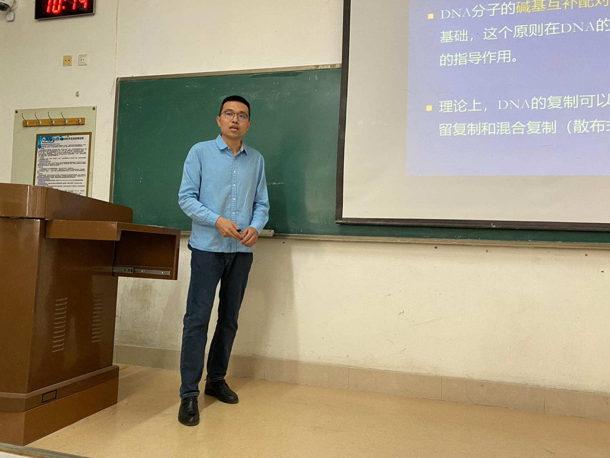 课堂中,李华围绕“DNA的复制”,讲解了从DNA的复制概况、复制体系、复制过程,到真核生物DNA的复制整个过程,课堂由浅入深,理论结合实际,还通过分析经典实验调动学生积极性,锻炼学生们的科学意识与能力。任课老师声音洪亮,整个课堂条理清晰,详略得当,逻辑性强。
