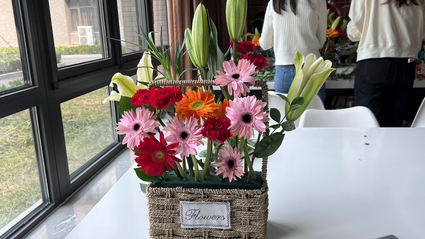 活动期间,老师们大胆发挥自己的想象力和创造力,精挑细选,相互合作,将非洲菊、百合、玫瑰、康乃馨等多种花材,按照材料特质、造型需要对花草进行修剪、整枝,再根据不同的色彩、形状有层次地搭配在一起。博物楼大厅也被样式多样、寓意美好的花篮装点地花团锦簇,变成一个花的海洋。