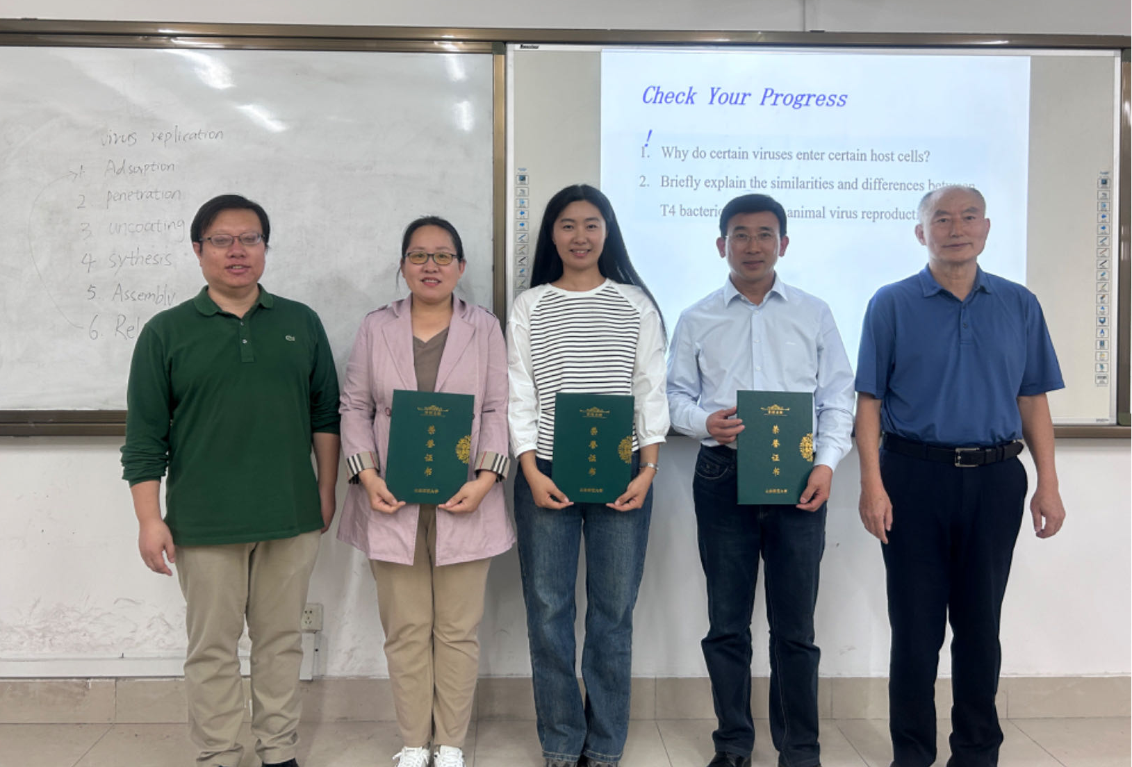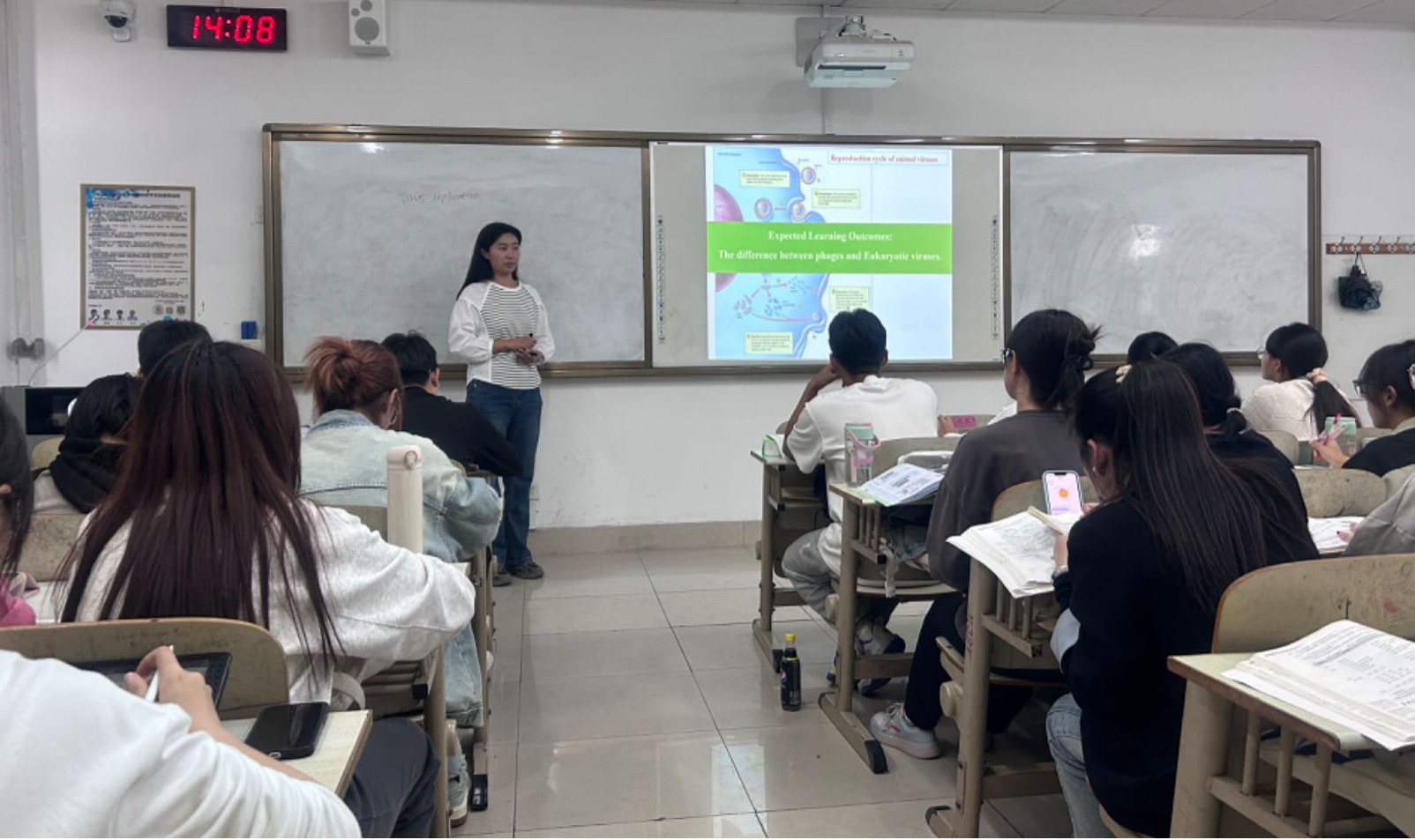 在课堂展示环节,张夙夙老师以《微生物学》(双语课程)第四章“病毒的繁殖与应用”为题,讲授了不同宿主类型病毒的繁殖过程等知识,深化同学们对病毒生物学特性的认识,引导学生辩证认识病毒在生态、进化及人类健康中的作用。整个课堂教学过程,张夙夙老师逻辑清晰,语言精炼,关注师生、生生互动,有效调动了学生思维和学习积极性。在讲授的过程中紧密结合实际并加以案例分析,课堂讲授深入浅出。整个授课展现了扎实的理论基础和授课技巧,受到师生的一致好评。
