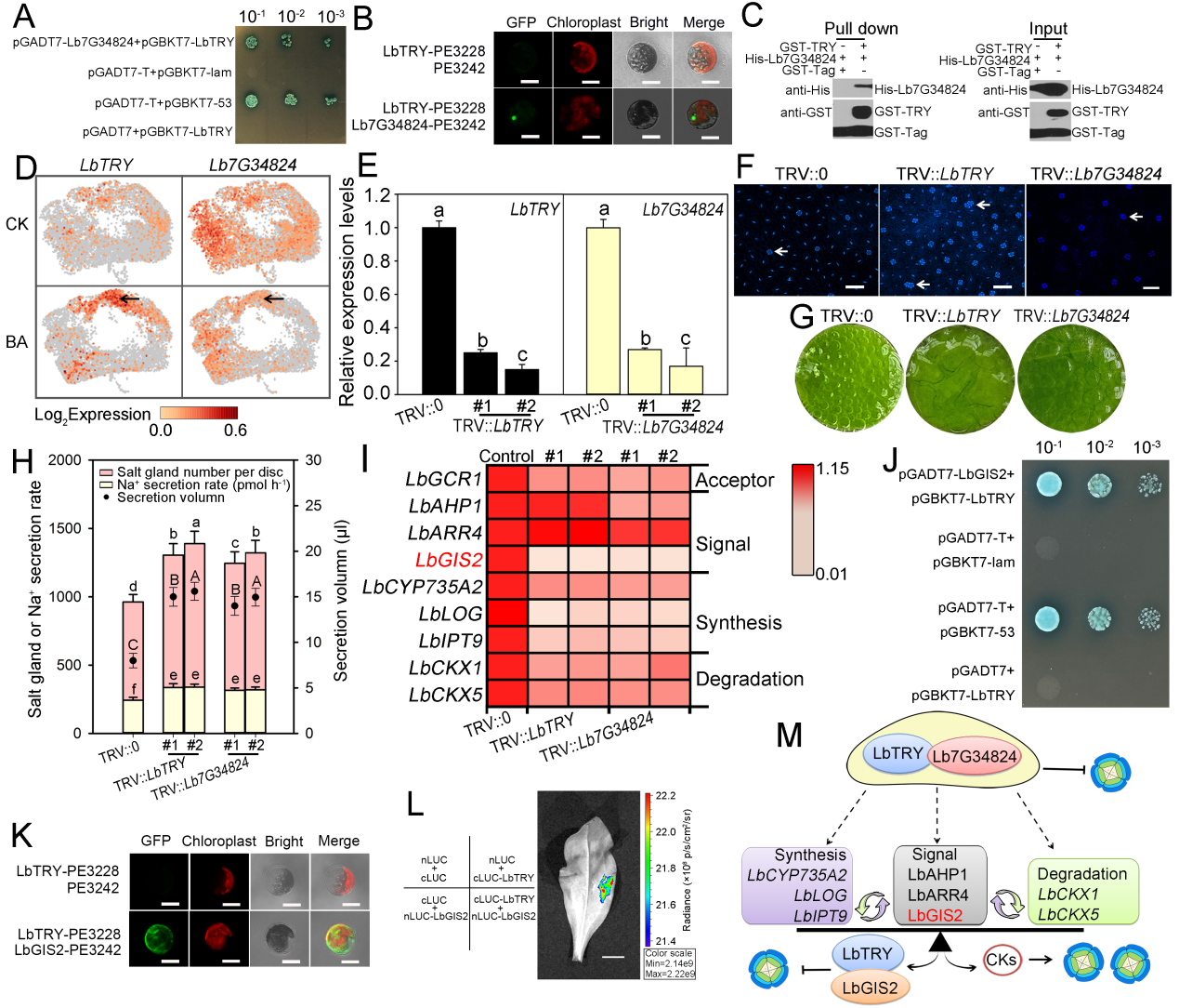 通过相关基因的表达模式和细胞学证据,进一步提出细胞分裂素参与盐腺发育。在细化细胞分裂素6-苄氨基嘌呤处理下的盐腺发育模式及原生质体制备的前提下,继续开展单细胞测序,并比较两组细胞群的异同,聚焦到5个与盐腺发育相关的亚群,通过盐腺发育的marker基因,定义了盐腺发育相关基因的发育轨迹(图2):亚群8、4或6到亚群3和1的盐腺特异性分化轨迹。此外,通过酵母双杂交,pull-down、BIFC等实验验证了TRIPTYCHON(LbTRY)分别与Lb7G34824、GLABROUS INFLORESCENCE STEMS 2的互作,以及互作蛋白在盐腺发育中的作用。它们调节细胞分裂素代谢和信号转导相关基因的表达,如CYTOKININ OXIDASE 5,以维持盐腺发育过程中细胞分裂素的稳态(图3),该研究结果为全面研究盐腺发育决定因子提供了有价值的背景数据和关键基因探究。