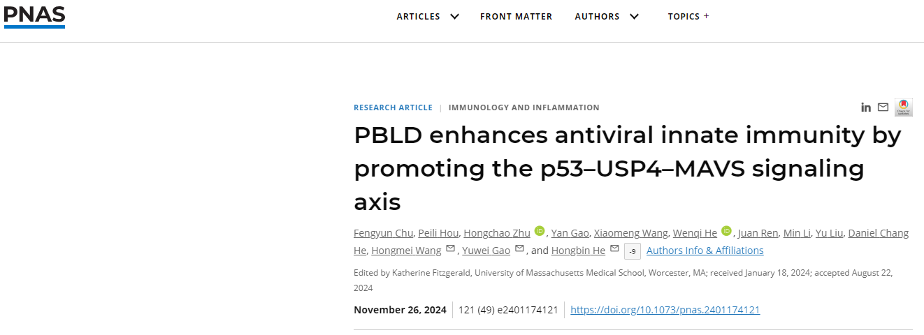 2024年11月26日,何洪彬教授领衔的动物病毒学团队在国际知名期刊Proc Natl Acad Sci U S A(PNAS)上在线发表了题为“PBLD enhances antiviral innate immunity by promoting the p53-USP4-MAVS signaling axis”的研究论文,揭示了吩嗪生物合成类结构域蛋白(PBLD)通过上调线粒体抗病毒信号蛋白(MAVS)促进抗RNA病毒天然免疫反应的新机制。