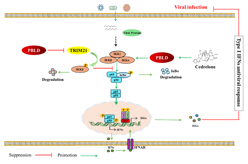 NF-κB信号通路作为一种经典天然免疫信号通路在抗病毒过程中发挥着重要的作用。先前的研究表明肠上皮细胞 (IEC) 中的 PBLD通过抑制 NF-κB 信号,减少炎症介质的产生,减轻溃疡性结肠炎症,改善肠道屏障功能。然而,在病毒感染过程中,PBLD如何调控NF-κB 信号通路尚不清楚。本研究发现了PBLD通过激活NF-κB促进抗病毒天然免疫反应的在病毒复制和抗病毒天然免疫反应中的作用。机制上,PBLD通过阻止TRIM21介导的p-IKKβ降解,激活NF-κB信号通路,进而促进I型干扰素反应,在细胞和鼠模型中抵抗病毒感染。此外,Cedrelone是一种柠檬苦素化合物,是PBLD的激活剂,能够诱导癌细胞凋亡,并具有抗肿瘤作用。该团队还发现了Cedrelone通过增加PBLD蛋白表达并随后激活NF-κB介导的IFN-I反应来抑制病毒复制。重要的是,Cedrelone的治疗潜力在于其能够增强原代巨噬细胞的抗病毒免疫力,并通过PBLD依赖的方式在HSV-1感染的小鼠中促进生存和减少肺组织损伤。综上所述,本研究不仅揭示了PBLD及Cedrelone在抗病毒天然免疫应答中的作用,为开发广谱抗病毒药物提供了潜在的组合模型,更为抗病毒感染的免疫机制及药物筛选提供了新视角。