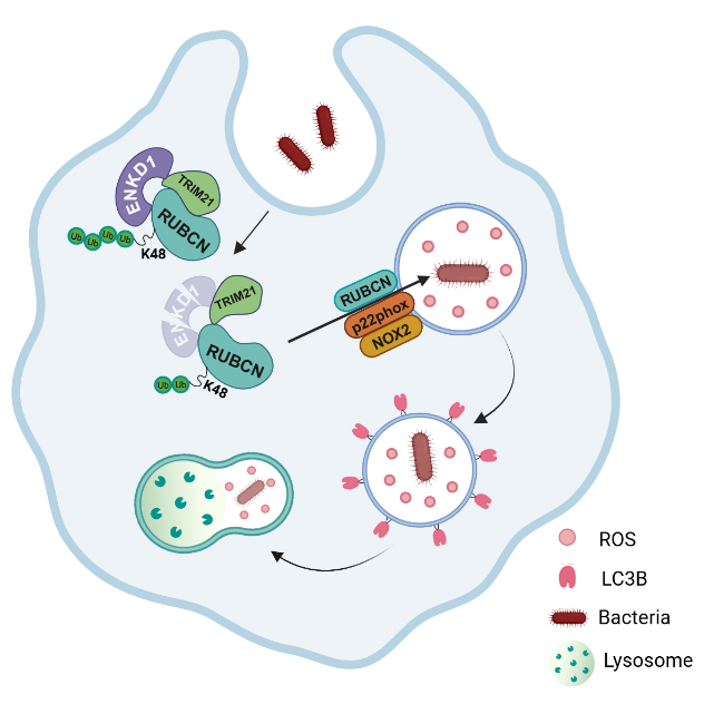 机制研究进一步表明,ENKD1作为分子支架招募E3泛素连接酶TRIM21,催化LC3相关吞噬作用关键蛋白RUBCN发生K48连接的多聚泛素化修饰,从而促进其通过蛋白酶体途径降解。该过程直接抑制RUBCN依赖的LC3相关吞噬,并最终削弱宿主对胞内菌的清除效率。