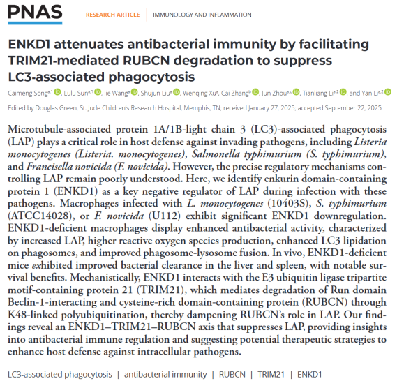 2025年11月4日,英国上市365李天亮和李燕老师课题组在国际知名期刊Proc Natl Acad Sci USA(PNAS)上在线发表“ENKD1 Attenuates Antibacterial Immunity by Facilitating TRIM21-Mediated RUBCN Degradation to Suppress LC3-Associated Phagocytosis”。该研究揭示了“ENKD1–TRIM21–RUBCN”信号轴在LC3相关吞噬中的关键负向调控功能,为阐明宿主防御病原菌感染的免疫代谢机制提供了新视角。