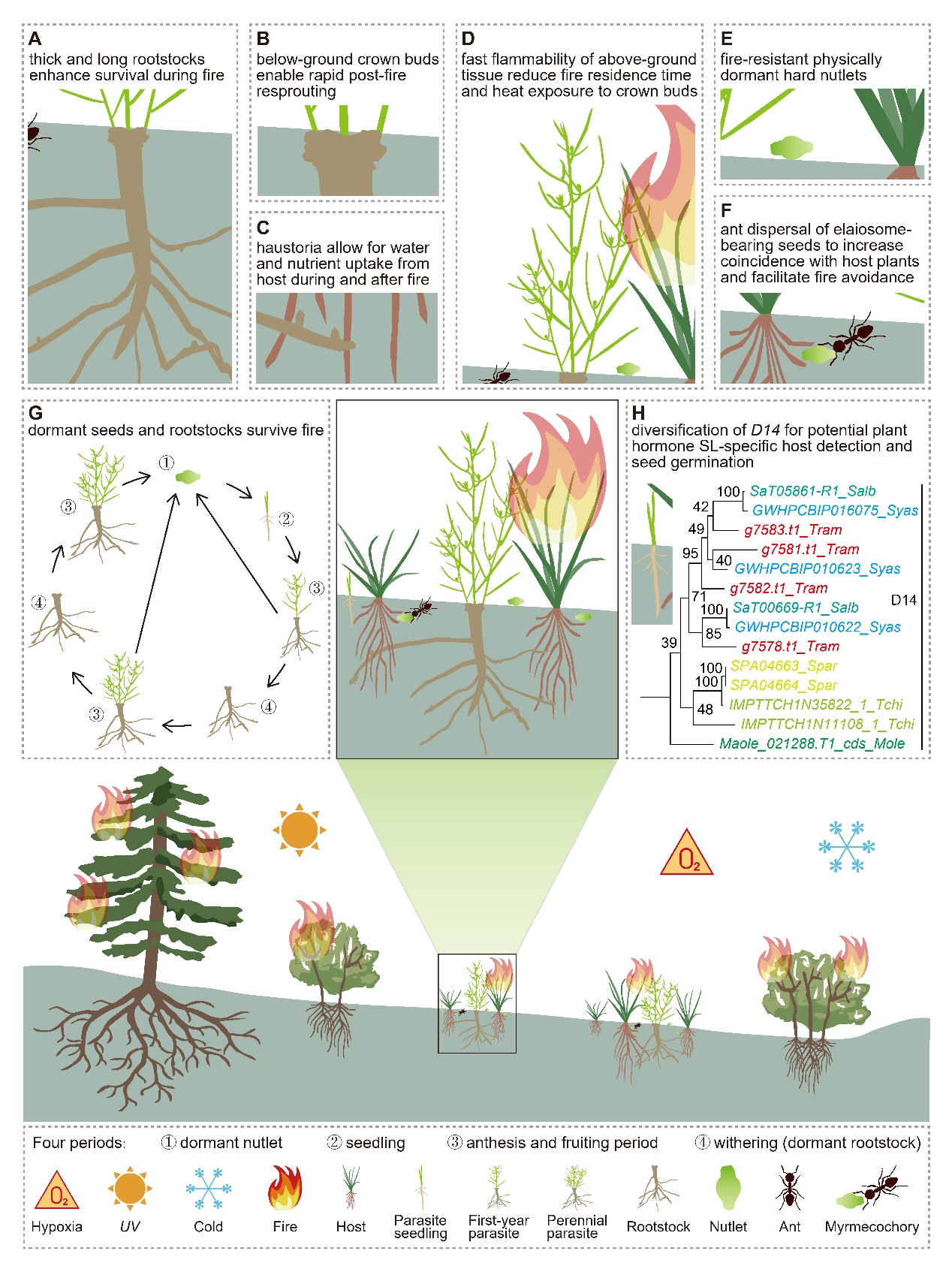 该研究首次解析了百蕊草属寄生植物的高质量基因组,揭示了檀香目寄生习性的古老起源和山火的驱动作用,阐明了“基因丢失与扩张”在寄生习性和高海拔山火适应中的协同演化机制,同时发现了D14基因家族扩张这一独特的适应策略,系统总结了滇西百蕊草的火适应策略,为植物应对复杂环境的适应研究提供了全新视角。随着全球气候变暖,高海拔山火频发,该研究不仅深化了植物对多重环境胁迫下适应演化规律的理解,也为预测植物应对未来极端气候(显著温度波动、频繁野火、强紫外线辐射)的响应提供了重要的基因组资源和理论依据。