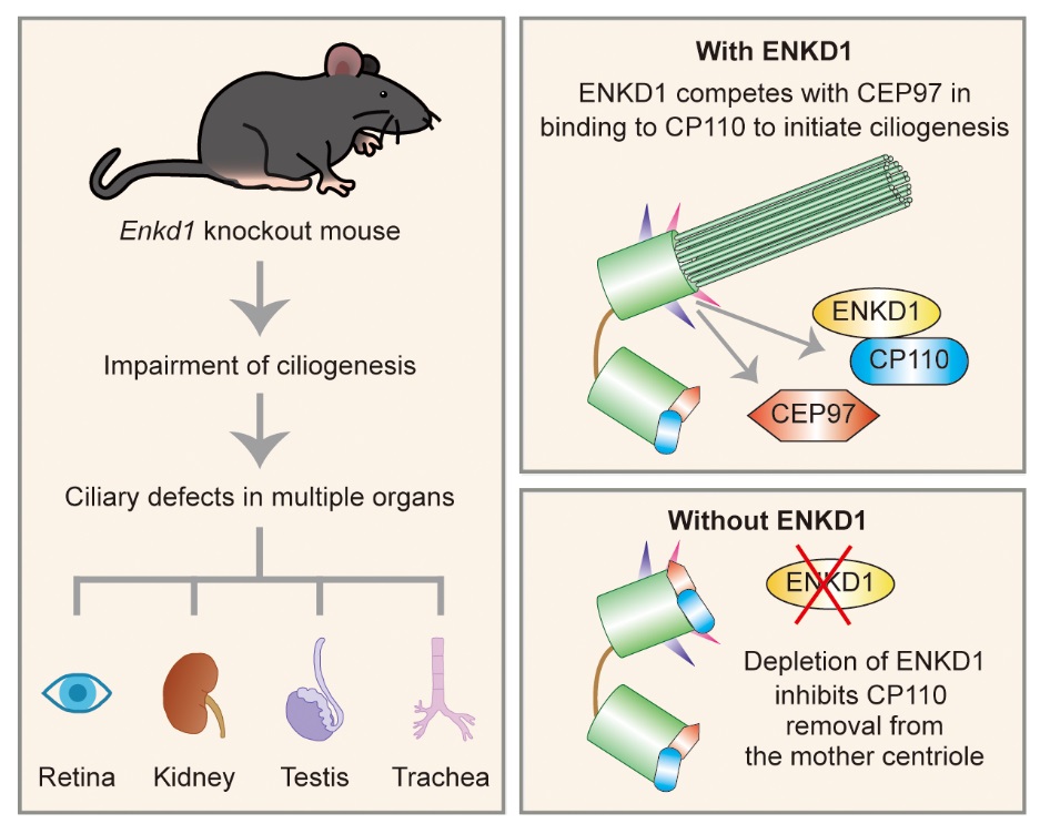 这项研究综合运用多种显微成像技术,发现含Enkurin 结构域蛋白1 (Enkurin domain-containing protein 1, ENKD1)为一种全新的中心体蛋白。为了揭示ENKD1的生物学功能,研究人员构建了Enkd1基因敲除小鼠并开展了细致的在体功能分析。通过检测视网膜和心脏功能以及分析精子活力,发现Enkd1基因敲除小鼠的视力、心脏功能以及精子的鞭毛结构显著异常,而这些器官结构或功能的正常建立与维持都与纤毛这一细胞器具有密不可分的关系。在对该基因敲除小鼠的多个纤毛化组织或器官进行显微分析后,研究人员发现这些组织或器官的纤毛形成的确呈现显著异常。随后研究人员通过一系列细胞生物学实验发现ENKD1参与调控中心体蛋白CP110从母中心粒移除,同时敲除ENKD1和CP110可以显著逆转ENKD1缺失引起的纤毛形成缺陷。为了进一步了解ENKD1调控纤毛形成的分子机理,研究人员通过蛋白质相互作用以及蛋白质竞争结合等生化分析,发现ENKD1通过在中心体与CEP97竞争结合CP110从而调控这一复合物从母中心粒的移除。一旦ENKD1缺失,CP110- CEP97的相互作用显著增强,从而使CP110滞留在母中心粒而无法启动纤毛的组装。