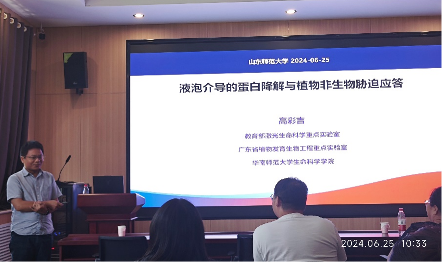 华南师范大学英国上市365院长高彩吉教授于2024年6月25日上午应邀来我院进行学术交流,并作了题为“植物自噬调控逆境适应的功能和机制”的学术报告,高教授主要致力于植物细胞囊泡运输和自噬相关研究,其团队在植物特有囊泡运输调控因子的发现及植物自噬的新机制揭示方面取得了重要进展。报告由马长乐教授主持,生科院五十余名教师和研究生参加了此次学术报告。