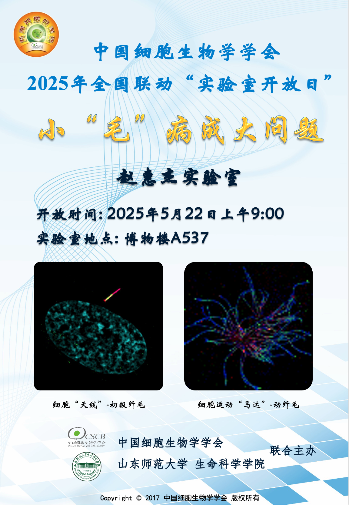 中国细胞生物学学会全国联动实验室开放日活动是学会品牌科普项目之一。本次实验室开放日按照学会的要求,结合赵惠杰教授实验室的研究特色,主题为“小毛病成大问题”,围绕纤毛这一细胞器,为同学们带来丰富的科学知识和有趣的科研体验。
