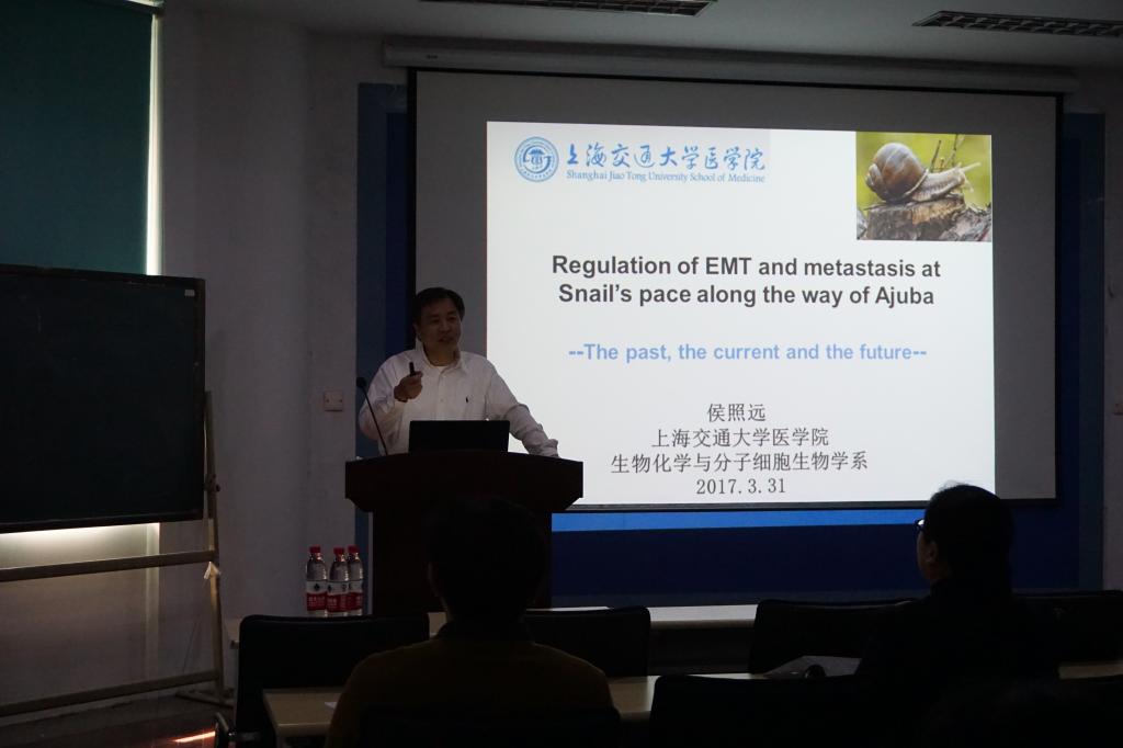 2017年3月31日上午10点,我院特邀上海交通大学医学院侯照远研究员在生命科学研究中心101报告厅作了题为“Regulation of EMT and metastasis at Snail’s pace along the way of Ajuba”的学术报告。报告会由生科院王宝山院长主持,杨桂文教授等及相关专业的老师和学生参加了此次报告。