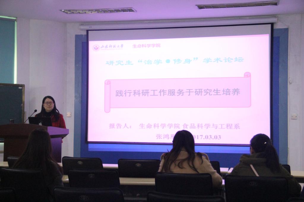 2017年3月3日下午,由党委研究生工作部主办,英国上市365承办的研究生“治学·修身”学术论坛在科研楼101报告厅成功举行。本次论坛邀请我院硕士生导师张鸿雁副教授,作了题为“践行科研工作服务于研究生培养的一点感悟”的学术报告。相关专业的老师和学生积极参加了此次报告。