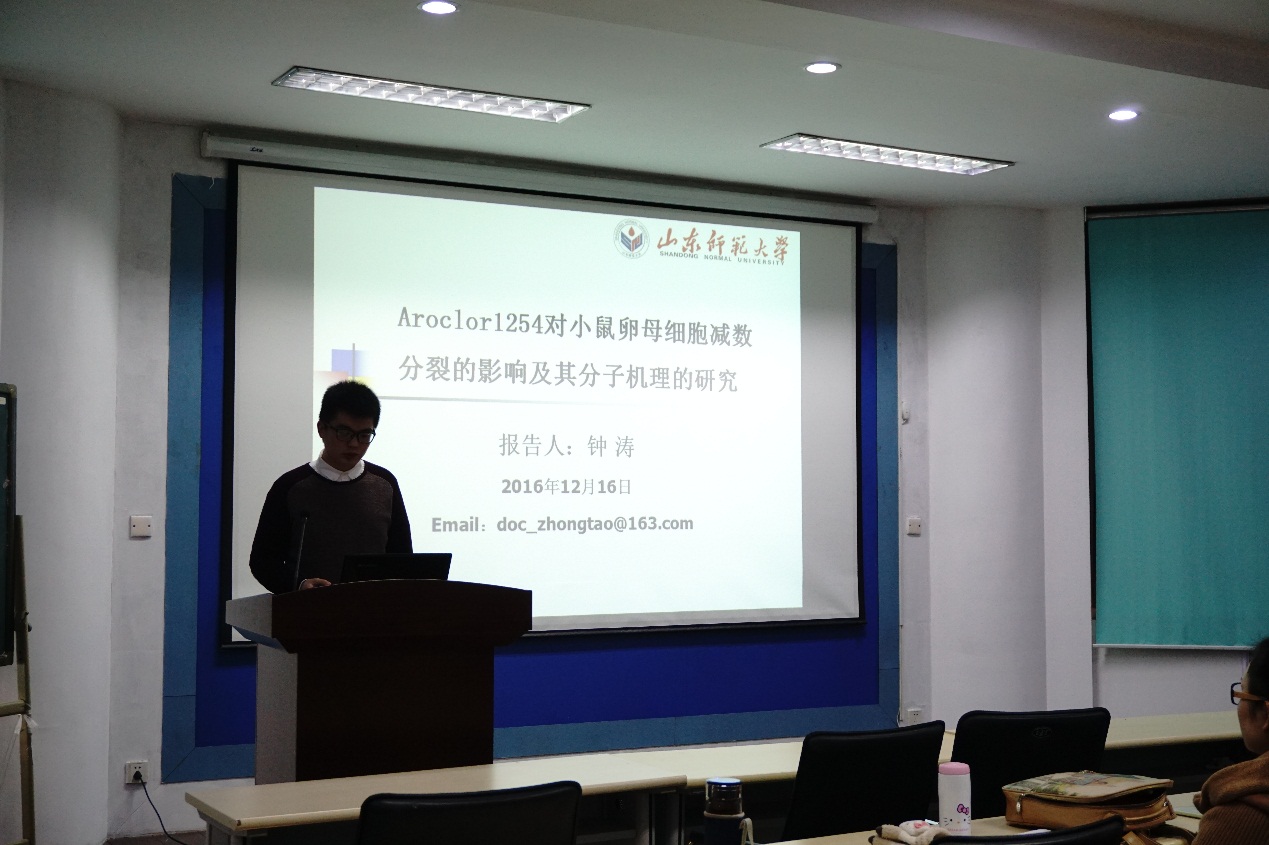 报告伊始,钟涛博士首先通过视频的形式简单介绍了脂溶性联苯混合物--多氯联苯(PCBs)在工业、科技、以及人们生活中的广泛应用,同时PCBs也会造成神经毒性、免疫疾病和智力低下等危害,从而引出报告内容。接着,钟涛向大家展示了实验结果,向卵母细胞中加入Aroclor 1254会使卵母细胞的数量减少,直径变短;同时也会使有丝分裂过程中纺锤体错排,从而使卵丘细胞走向凋亡。随后他向大家介绍了丙烯酰胺(ACR),ACR也能够促进卵母细胞凋亡;不同食物中丙烯酰胺的含量不同,在未煮熟或未加热的食品中几乎检测不到丙烯酰胺。之后钟博士对其实验流程进行了详细讲解,使同学们对自己的实验流程有了一个新的认识和改进。在进行专业知识交流的同时,钟博士还与同学们共同分享了其在科研过程中的收获及遇到的常见问题。会场气氛热烈,同学们踊跃提出疑问,兴趣十分浓厚。