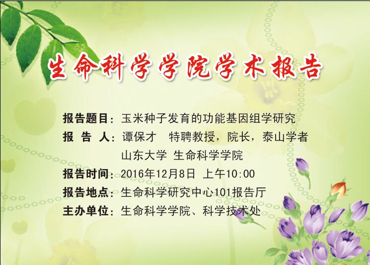 2016年12月8日上午,山东大学英国上市365院长、泰山学者谭保才教授来我校作了题为“玉米种子发育的功能基因组学研究”的学术报告。报告会在生命科学研究中心101报告厅举行,由生科院院长王宝山教授主持,相关专业的老师和研究生们聆听了此次报告。