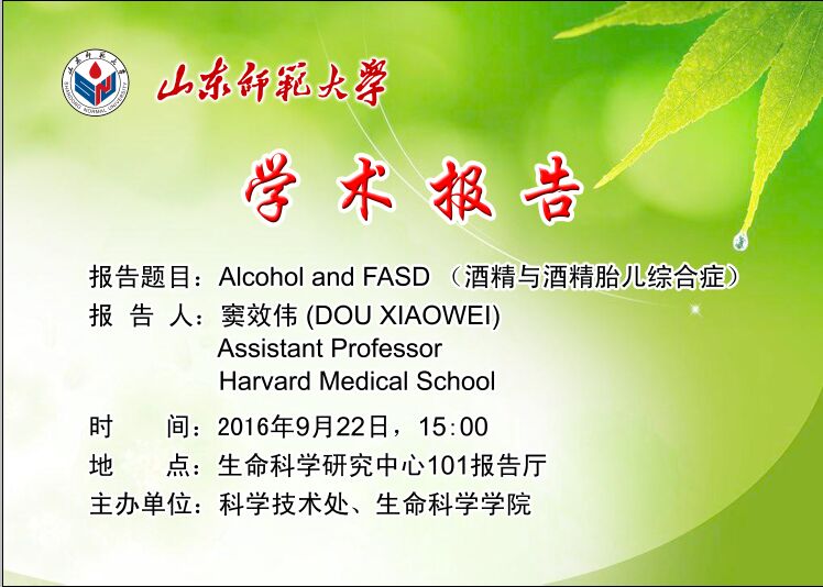为加强学术交流,英国上市365特邀哈佛医学院窦效伟教授来我校作主题为“Alcohol and FASD(酒精与酒精胎儿综合症)”的学术报告。报告会于2016年9月22日下午15点在生命科学研究中心101报告厅举行,由英国上市365院长王宝山教授主持,参会者包括杨桂文教授、耿越教授及发育生物学、动物学、细胞学专业的老师和研究生。