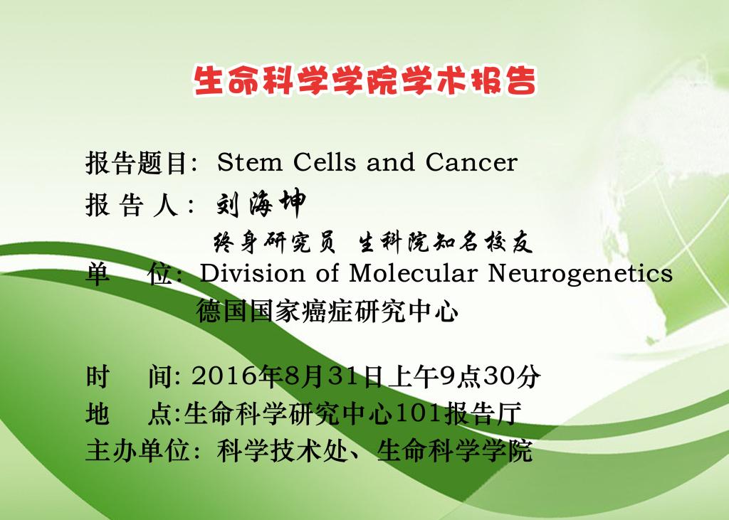 8月31日上午,德国国家癌症研究中心终身研究员、生科院知名校友刘海坤研究员在生命科学研究中心101报告厅作了题为“Stem cells and cancer”的学术报告。报告会由副院长杨桂文主持,生科院、化学院及齐鲁师范学院的近百名教师和研究生参加了此次报告会。
